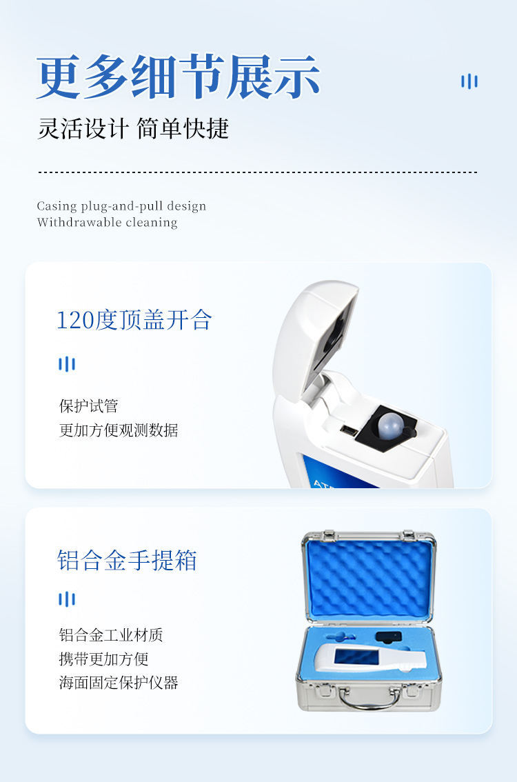 該設(shè)備采用生物化學(xué)反應(yīng)方法檢測ATP含量,潔凈度檢測儀基于螢火蟲發(fā)光原理,利用“熒光素酶—熒光素體系”快速檢測三磷酸腺苷(ATP)。ATP拭子含有可以裂解細(xì)胞膜的試劑,能將細(xì)胞內(nèi)ATP釋放出來,與試劑中含有的特異性酶發(fā)生反應(yīng),產(chǎn)生光,再用熒光照度計檢測發(fā)光值,微生物的數(shù)量與發(fā)光值成正比,由于所有生物活細(xì)胞中含有恒量的ATP,所以ATP含量可以清晰地表明樣品中微生物與其他生物殘余的多少,用于判斷衛(wèi)生狀況。