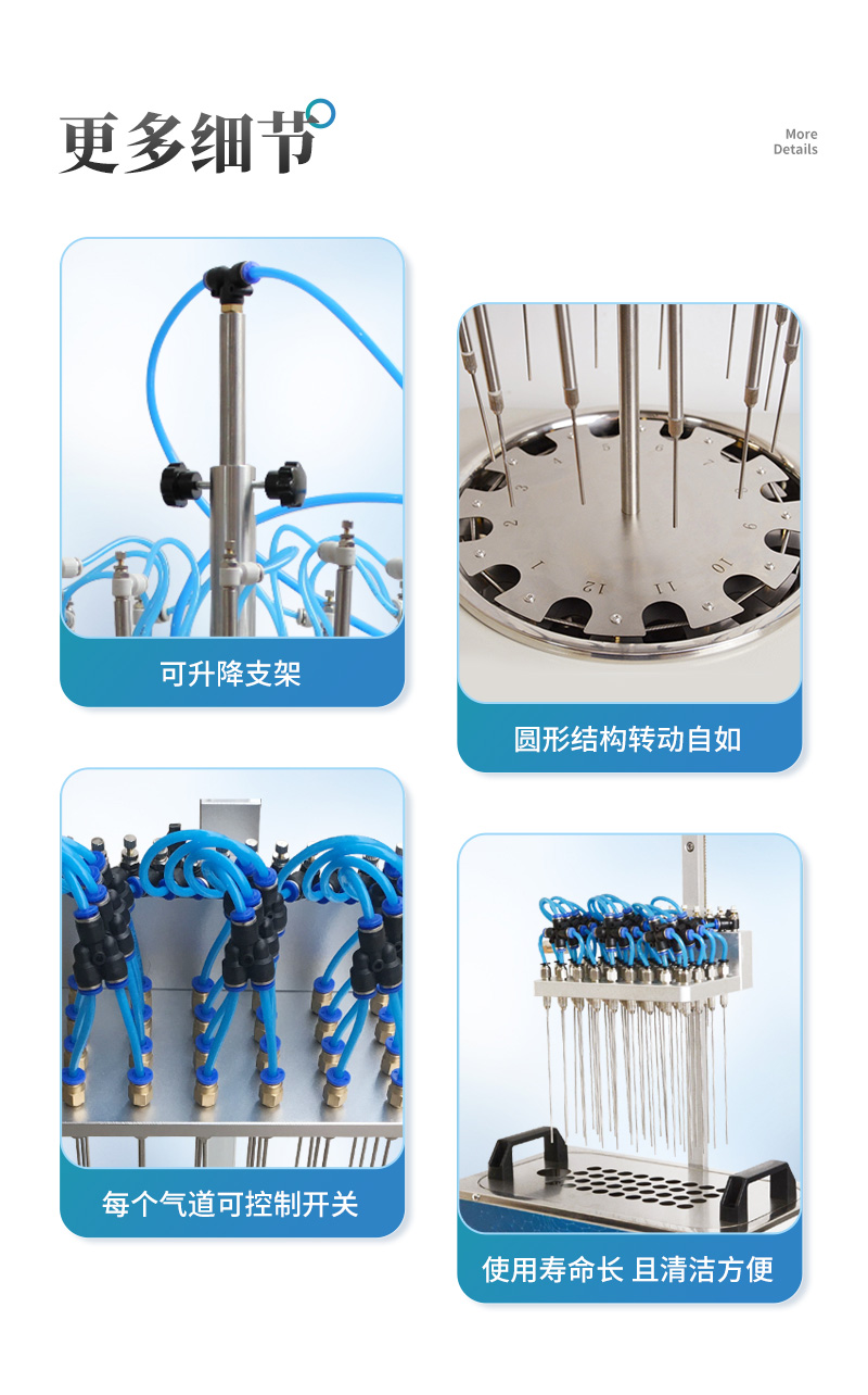 3、氮吹儀有36個(gè)氣道控制開關(guān),節(jié)約氣體,每根吹氣針的位置可獨(dú)立改變吹掃位置,使之適用不同的樣品容器及不同的樣品位置
