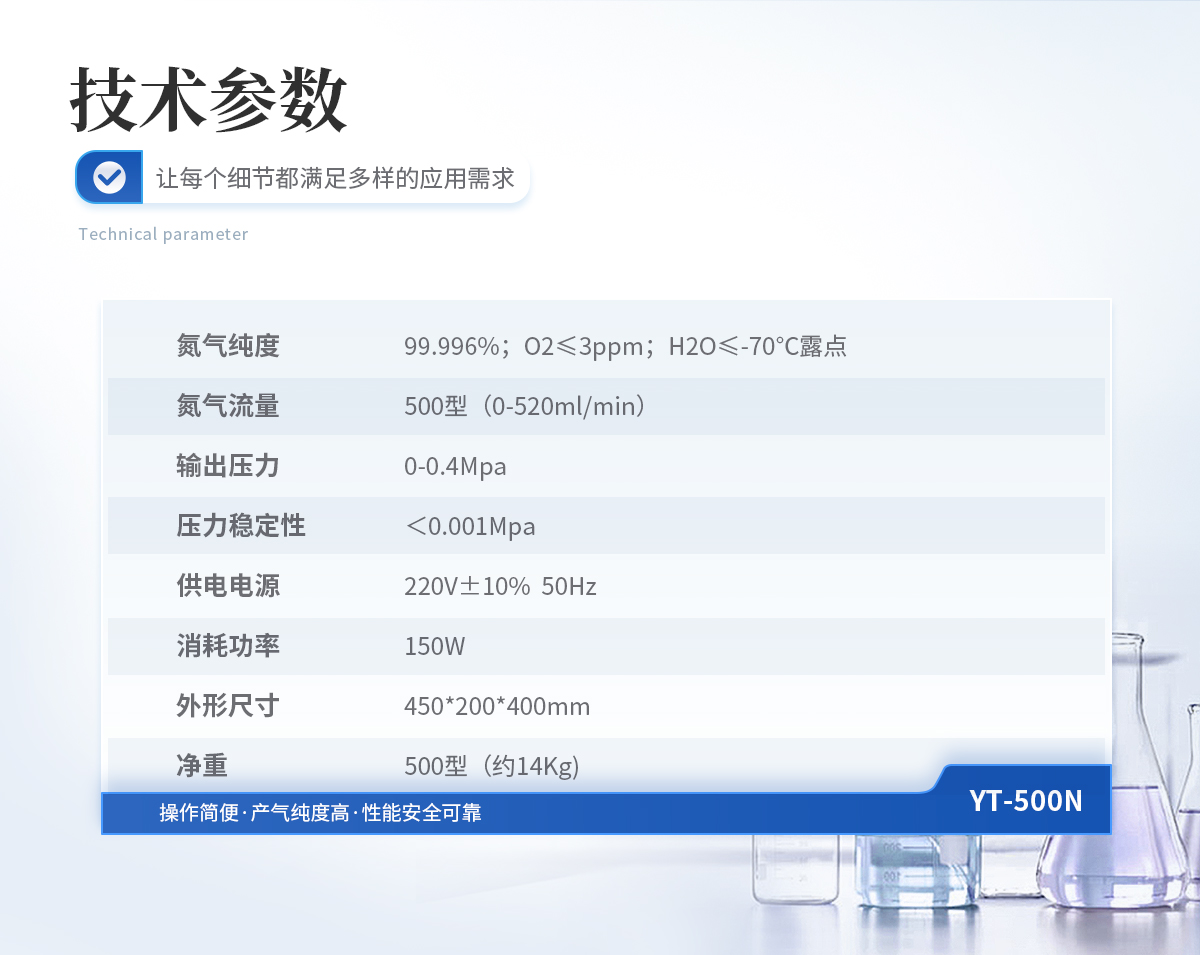 | 1、氮?dú)饧兌龋? 99.996%;O2≤3ppm;H2O≤-70℃露點(diǎn) | 2、氮?dú)饬髁浚? 500型(0-520ml/min) | 3、輸出壓力: 0-0.4Mpa | 4、壓力穩(wěn)定性:<0.001Mpa | 5、供電電源: 220V±10% 50Hz | 6、消耗功率: 150W | 7、外形尺寸: 450*200*400mm | 8、凈重: 500型(約14Kg) |