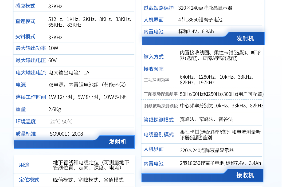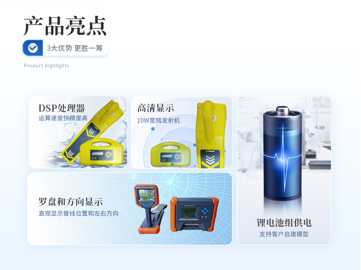 | 1、采用DSP處理器,運(yùn)算速度快,精度更高; | 2、帶有導(dǎo)向功能指標(biāo)管線走向,定位更快; | 3、采用10W寬頻發(fā)射機(jī),適應(yīng)各種環(huán)境的探測; | 4、接收機(jī)和發(fā)射機(jī)都采用鋰電池組供電,節(jié)能環(huán)保,每年可節(jié)省3000-5000元的電池費(fèi)用。 |