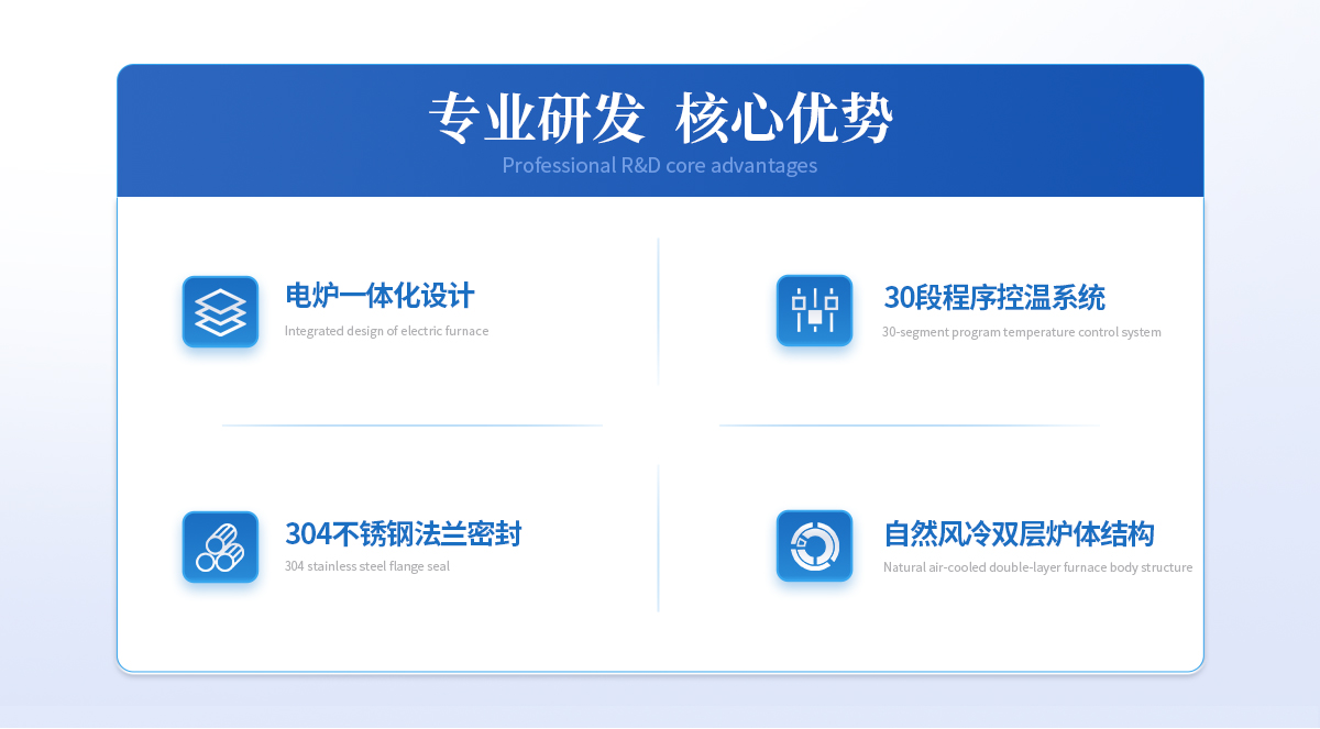 | 1、爐膛采用優(yōu)質(zhì)氧化鋁纖維材料,保溫性能好,耐用,拉伸強(qiáng)度高,無(wú)雜球,純度高,節(jié)能效果明顯; | 2、加熱元件采用優(yōu)質(zhì)HRE電阻絲,大大提高了其使用壽命; | 3、超溫報(bào)警,漏電保護(hù),操作安全可靠。 |