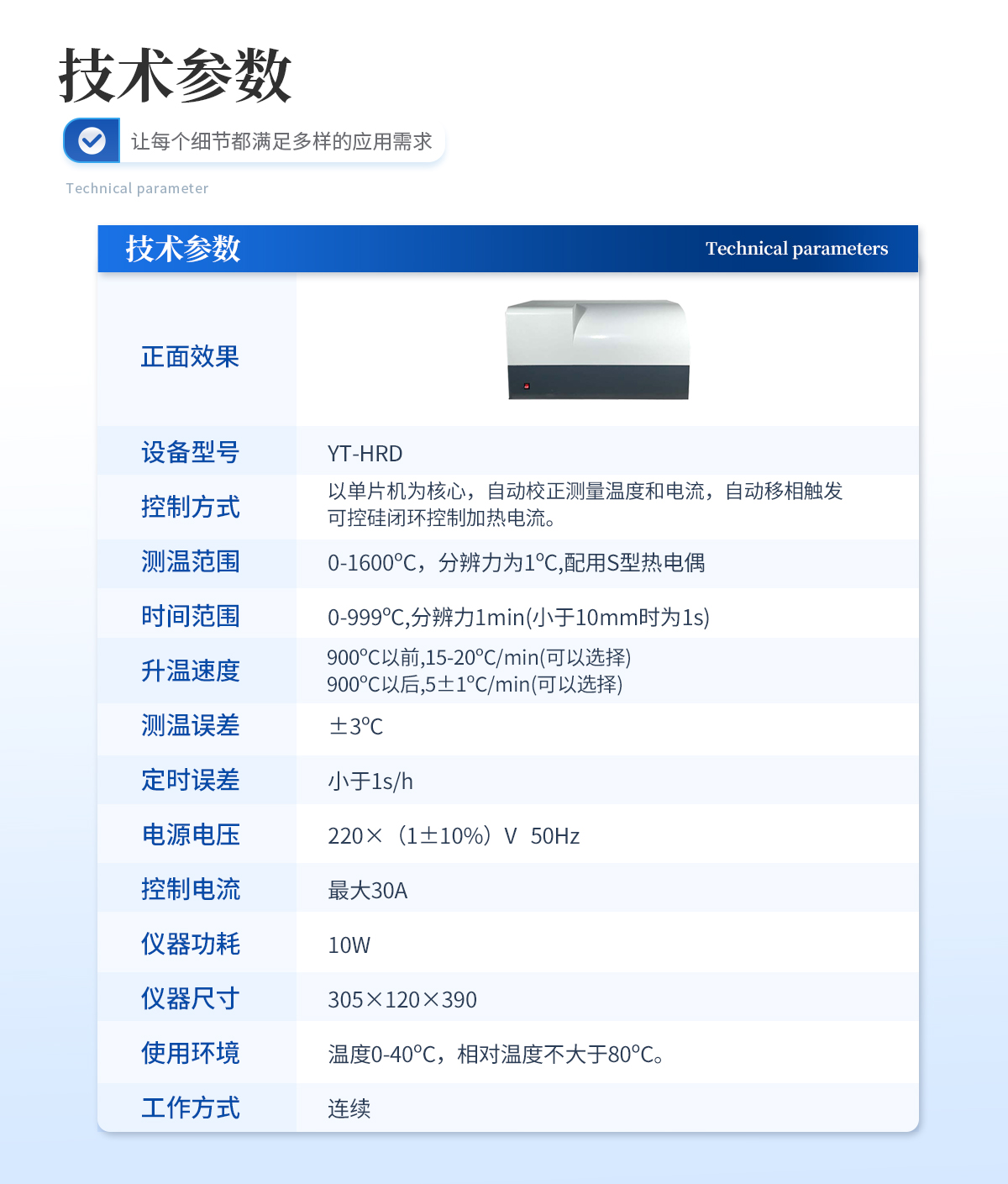 | 1、控制方式:以單片機為核心,自動校正測量溫度和電流,自動移相觸發(fā)可控硅閉環(huán)控制加熱電流。 | 2、測溫范圍:0-1600oC,分辨力為1oC,配用S型熱電偶. | 3、時間范圍:0-999oC,分辨力1min(小于10mm時為1s) | 4、升溫速度:900oC以前,15-20oC/min(可以選擇).900oC以后,5±1oC/min(可以選擇) | 5、測溫誤差:±3oC | 6、定時誤差:小于1s/h | 7、電源電壓:220×(1±10%)V 50Hz | 8、控制電流:**30A | 9、儀器功耗:10W | 10儀器尺寸(mm):305×120×390 | 11、使用環(huán)境:溫度0-40oC,相對溫度不大于80oC | 12、工作方式:連續(xù) |