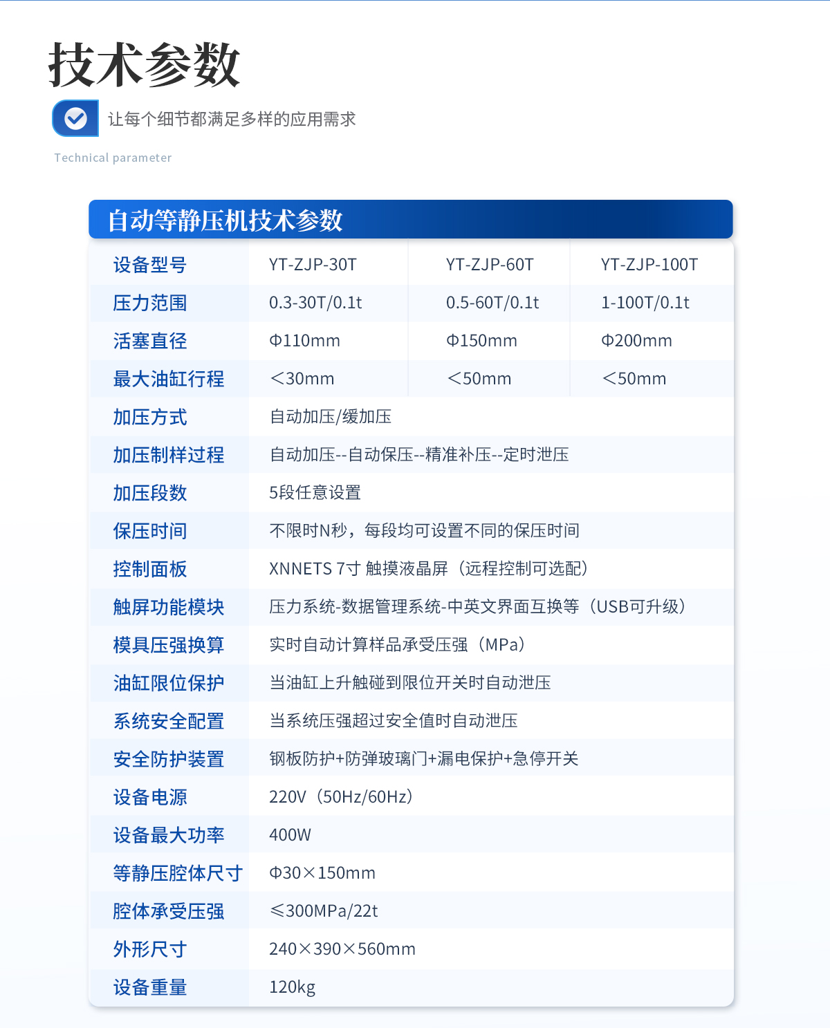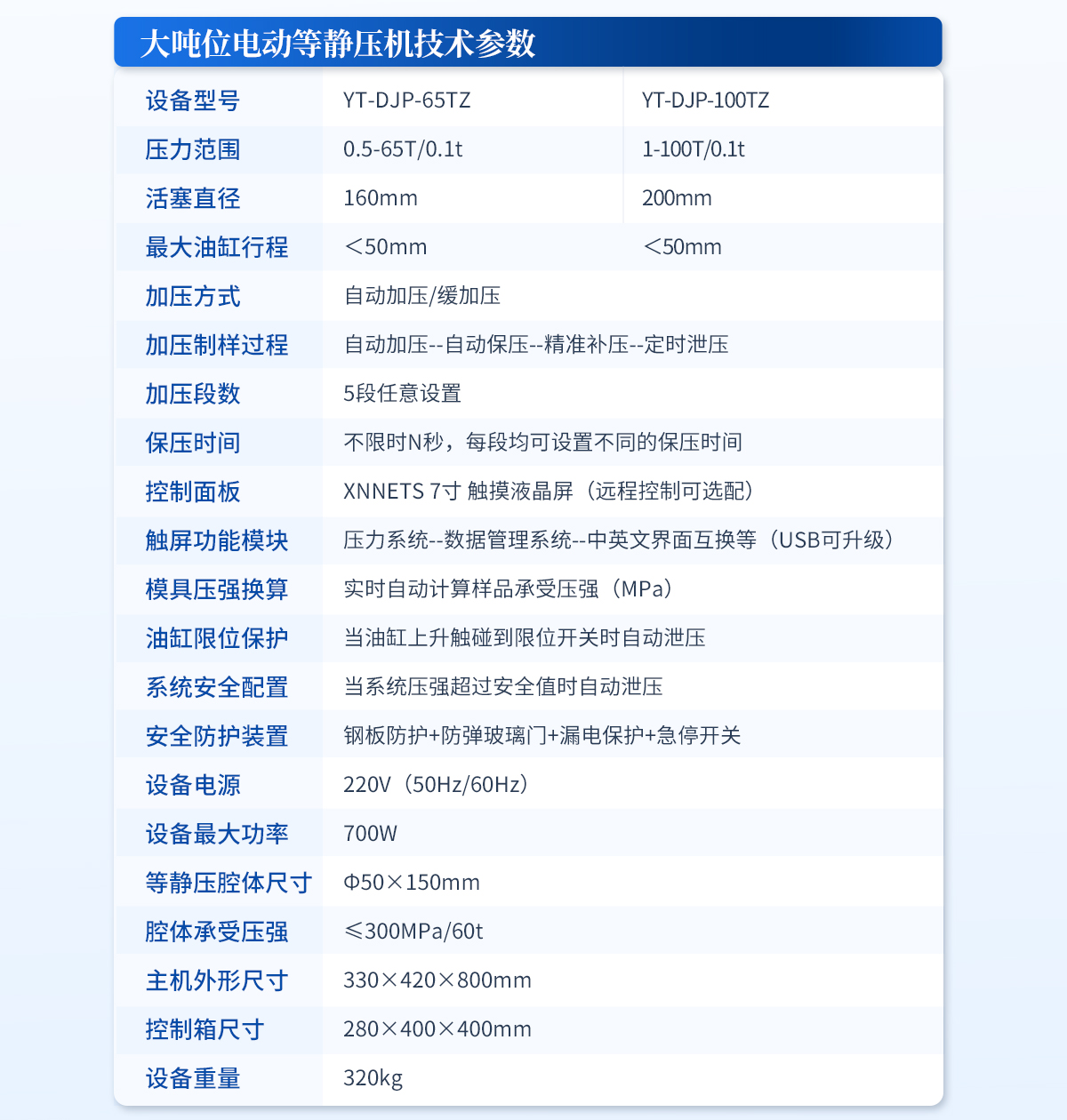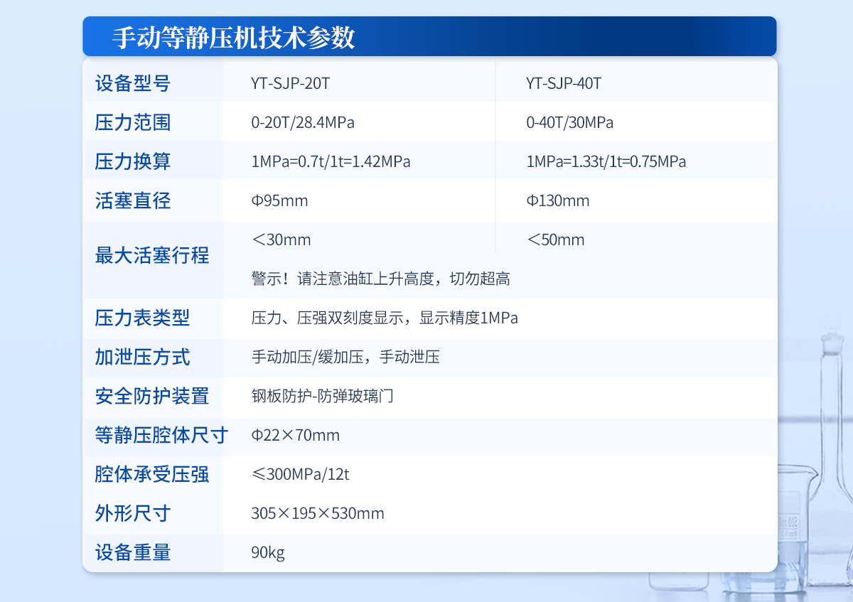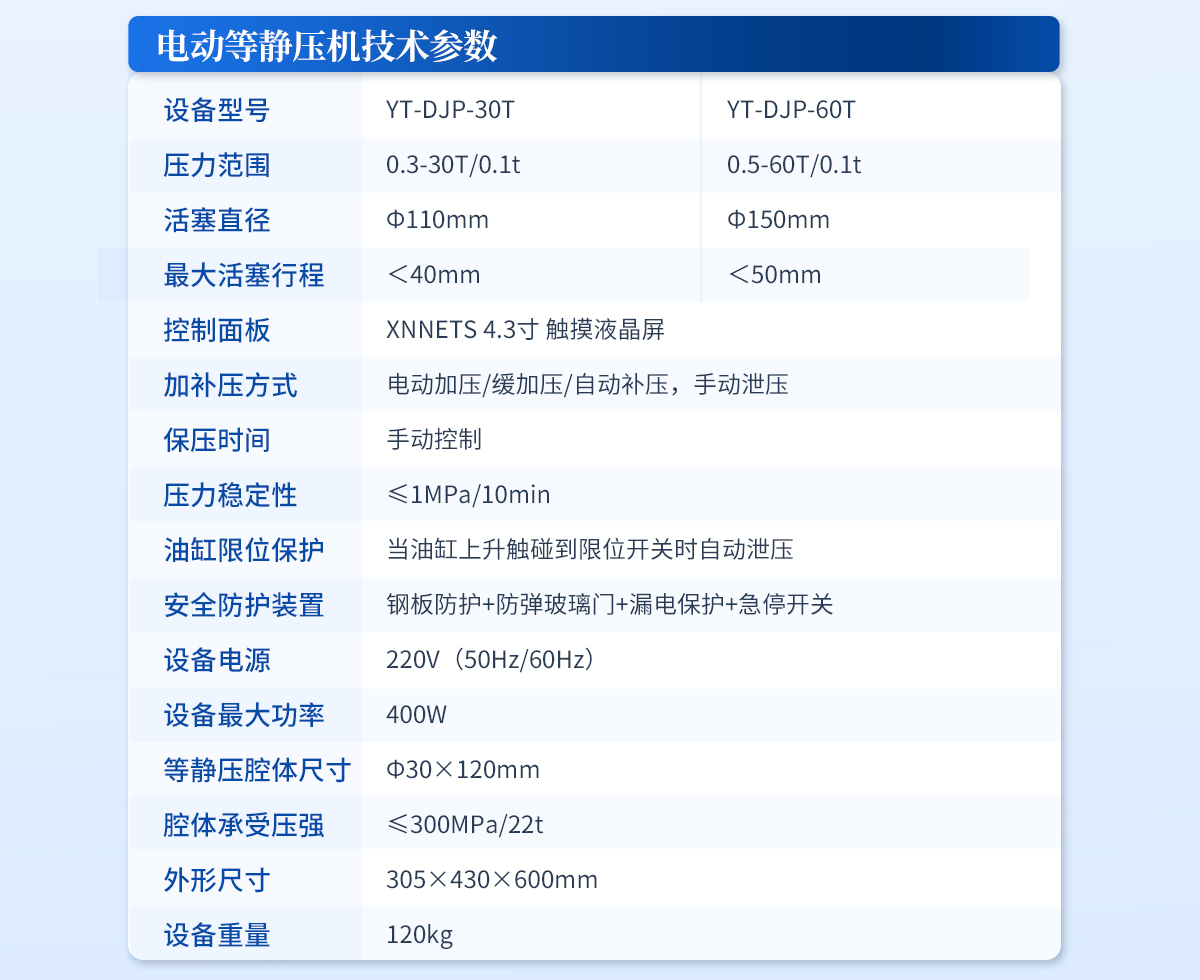 | 規(guī)格型號(hào):YT-DJP-65TZ | 壓力范圍:0.5-65T/0.1t | 活塞直徑 :160mm | **油缸行程:<50mm | 加壓方式:自動(dòng)加壓/緩加壓 | 加壓制樣過程:自動(dòng)加壓--自動(dòng)保壓--精準(zhǔn)補(bǔ)壓--定時(shí)泄壓 | 加壓段數(shù):5段任意設(shè)置 | 保壓時(shí)間 :不限時(shí)N秒,每段均可設(shè)置不同的保壓時(shí)間 | 控制面板:XNNETS 7寸 觸摸液晶屏(遠(yuǎn)程控制可選配) | 觸屏功能模塊:壓力系統(tǒng)-數(shù)據(jù)管理系統(tǒng)--中英文界面互換等(USB可升級(jí)) | 模具壓強(qiáng)換算:實(shí)時(shí)自動(dòng)計(jì)算樣品承受壓強(qiáng)(MPa) | 油缸限位保護(hù):當(dāng)油缸上升觸碰到限位開關(guān)時(shí)自動(dòng)泄壓 | 系統(tǒng)安全配置:當(dāng)系統(tǒng)壓強(qiáng)超過安全值時(shí)自動(dòng)泄壓 | 安全防護(hù)裝置:鋼板防護(hù)+防彈玻璃門+漏電保護(hù)+急停開關(guān) | 設(shè)備電源:220V(50Hz/60Hz) | 設(shè)備**功率:700W | 等靜壓腔體尺寸:Φ50×150mm | 腔體承受壓強(qiáng):≤300MPa/60t | 主機(jī)外形尺寸:330×420×800mm | 控制箱尺寸:280×400×400mm | 設(shè)備重量 :320kg | 配置說明:主機(jī)1臺(tái),控制箱1臺(tái),等靜壓腔體1套!可根據(jù)需求定制500MPa等靜壓機(jī)或橡膠模具 |