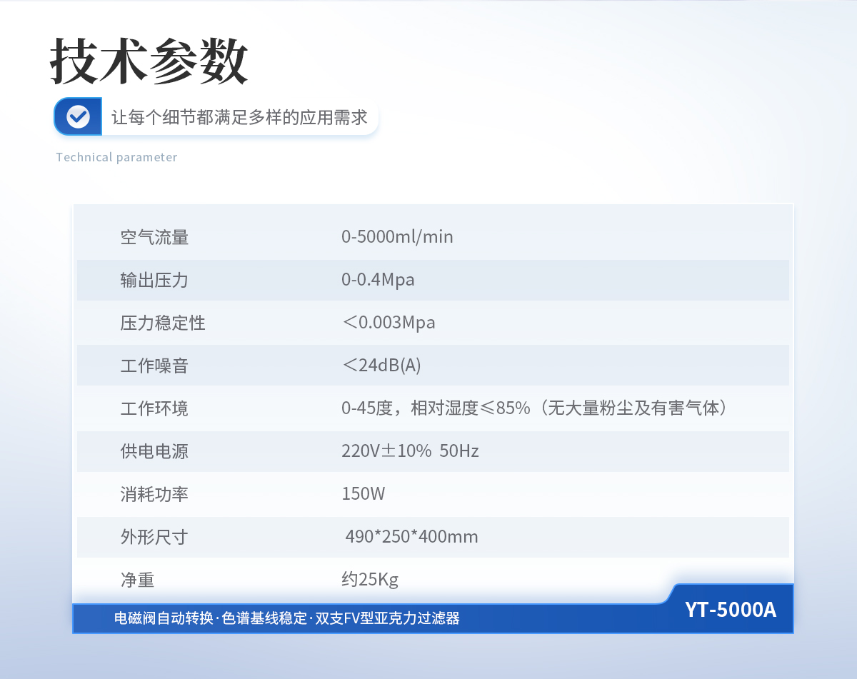 1、空氣流量: 0-5000ml/min 2、輸出壓力: 0-0.4Mpa 3、壓力穩(wěn)定性:<0.003Mpa 4、工作噪音: <24dB(A) 5、工作環(huán)境: 0-45度,相對(duì)濕度≤85%(無(wú)大量粉塵及有害氣體) 6、供電電源: 220V±10% 50Hz 7、消耗功率: 150W 8、外形尺寸: 490*250*400mm 9、凈重: 約25Kg