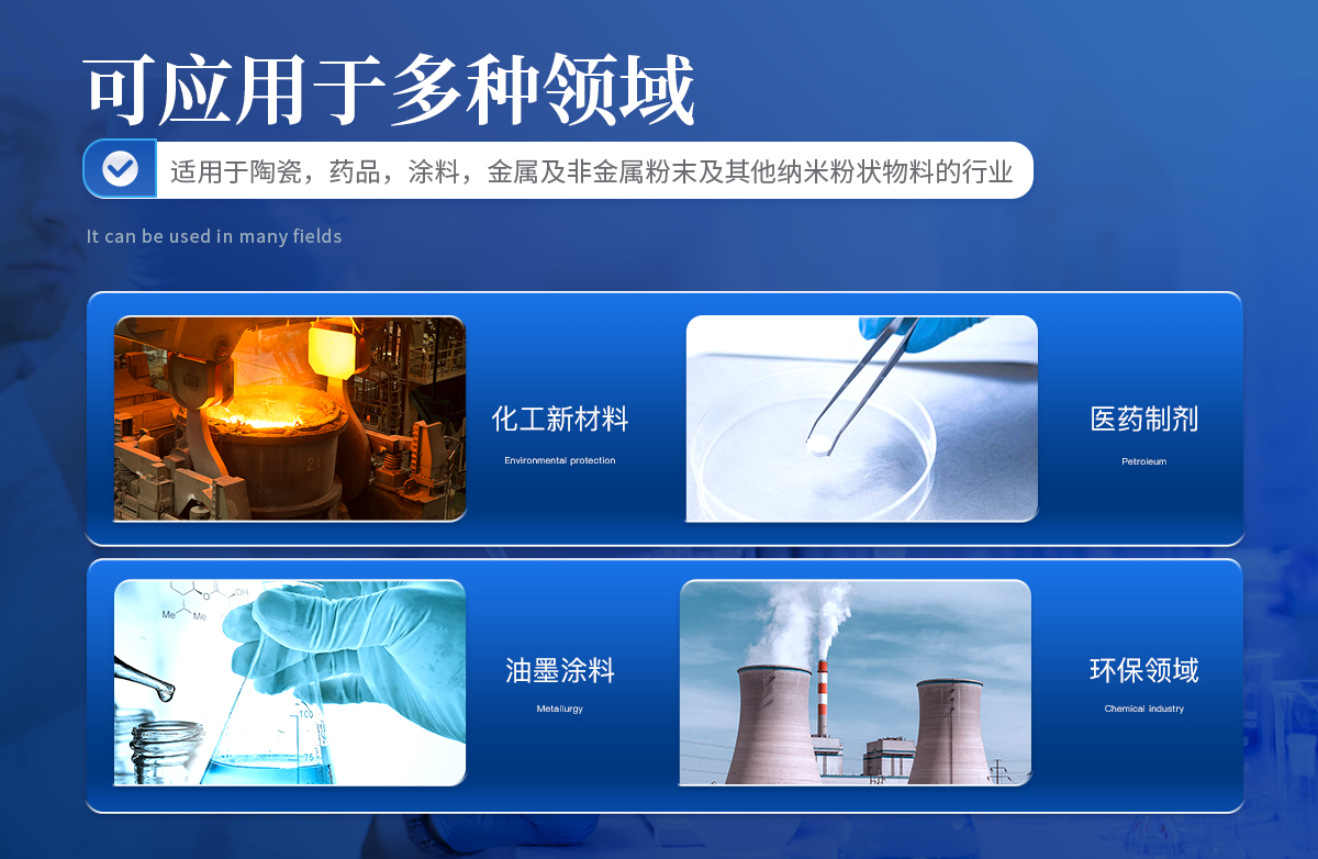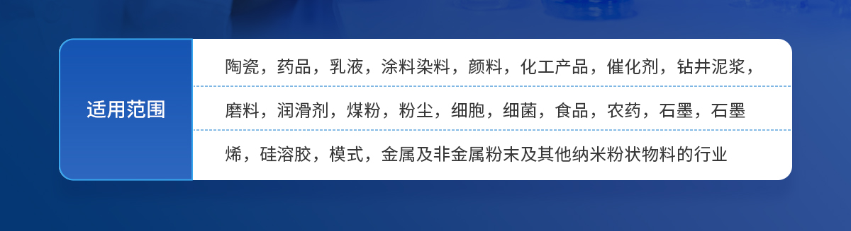 陶瓷,藥品,乳液,涂料染料,顏料,化工產(chǎn)品,催化劑,鉆井泥漿,磨料,潤(rùn)滑劑,煤粉,粉塵,細(xì)胞,細(xì)菌,食品,農(nóng)藥,石墨,石墨烯,硅溶膠,模式,金屬及非金屬粉末及其他納米粉狀物料的行業(yè)。