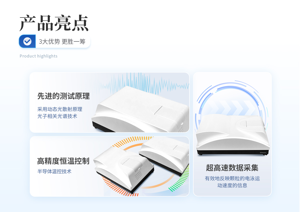 | 雙波長(zhǎng)激光器,全自動(dòng)切換 獨(dú)家采用雙波長(zhǎng)(λ= 405nm、λ= 532nm)激光器搭建而成的光路系統(tǒng),相關(guān)譜探測(cè)系統(tǒng)不僅體積小,而且具有很強(qiáng)的抗干擾能力,從而保證了測(cè)試的穩(wěn)定性;對(duì)某些具有吸光屬性,傳統(tǒng)單一波長(zhǎng)激光器無法檢測(cè)的樣品,可進(jìn)行有效檢測(cè); | **的測(cè)試原理 采用動(dòng)態(tài)光散射原理和光子相關(guān)光譜技術(shù),根據(jù)顆粒在液體中的布朗運(yùn)動(dòng)速度測(cè)定顆粒大小。大小顆粒運(yùn)動(dòng)速度不同,激光照射這些顆粒,不同大小的顆粒將使散射光發(fā)生快慢不同的漲落起伏。光子相關(guān)光譜法就根據(jù)特定方向的光子漲落起伏分析其顆粒大小。 | 超高速數(shù)據(jù)采集 使用PCS技術(shù)測(cè)定納米級(jí)顆粒大小,必須能夠分辨納秒級(jí)信號(hào)起伏。本儀器的核心部件采用我公司研制的CR256數(shù)字相關(guān)器,具有識(shí)別8ns的**分辨能力和**的信號(hào)處理速度,其數(shù)據(jù)處理速度高達(dá)162M。它能實(shí)時(shí)完成動(dòng)態(tài)散射光強(qiáng)的采集和自相關(guān)函數(shù)運(yùn)算,從而有效地反映不同大小顆粒的動(dòng)態(tài)分光散射信息,為測(cè)試結(jié)果的準(zhǔn)確性典型基礎(chǔ)。 | 高靈敏度和信噪比 采用專業(yè)級(jí)高性能光電倍增管,對(duì)光子信號(hào)具有**的靈敏度和信噪比。 | 高精度雙溫控保護(hù)系統(tǒng) 采用半導(dǎo)體溫控技術(shù),樣品池溫控系統(tǒng)和激光器溫控系統(tǒng)精度高達(dá)±0.1℃,使被測(cè)樣品和激光器光源在整個(gè)測(cè)試過程中都處于恒溫狀態(tài),避免溫度變化對(duì)不測(cè)試結(jié)果的影響,確保測(cè)試準(zhǔn)確和重復(fù); | 穩(wěn)定的光路系統(tǒng) 采用光纖技術(shù)搭建而成的光路系統(tǒng),使光子相關(guān)譜探測(cè)系統(tǒng)不僅體積小,而且具有很強(qiáng)的抗干擾能力,從而保證了測(cè)試的穩(wěn)定性。 |