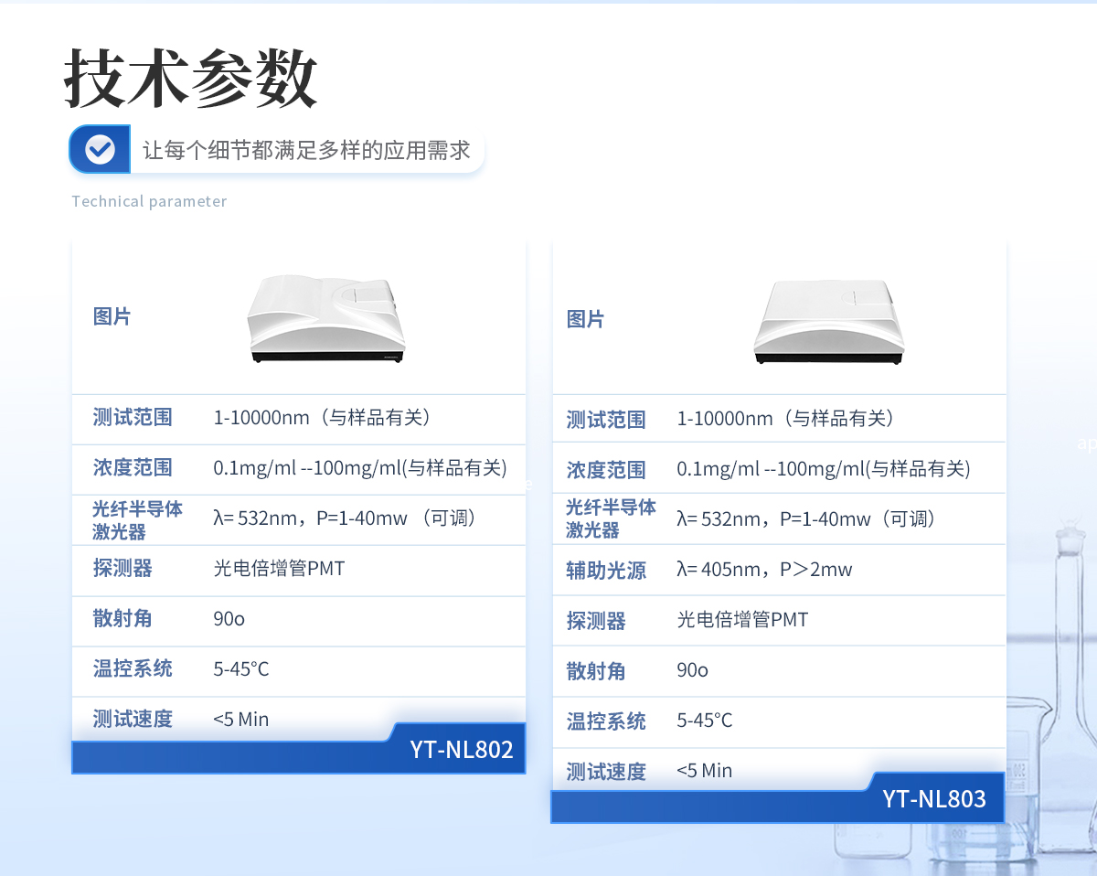 | 規(guī)格型號(hào):YT-NL802 | 執(zhí)行標(biāo)準(zhǔn):GB/T 19627-2005/ISO 13321-1996 GB/T 29022-2012/ISO 22412-2008 | 測(cè)試范圍 :1-10000nm(與樣品有關(guān)) | 濃度范圍:0.1mg/ml--100mg/ml(與樣品有關(guān)) | 準(zhǔn)確度誤差:<1%(國(guó)家標(biāo)準(zhǔn)樣品d50值)> | 重復(fù)性誤差:<1%(國(guó)家標(biāo)準(zhǔn)樣品d50值)> | 激光光源:光纖半導(dǎo)體激光器,λ= 532nm,P=1-40mw (可調(diào)) | 探測(cè)器:光電倍增管PMT | 散射角:90o | 樣品池體積:10mm*10mm*40mm, 1--4mL | 溫控范圍:5-45℃ | 溫控精度:0.1℃ | 測(cè)試速度:<5 min=""> | 數(shù)字相關(guān)器主要參數(shù): (1)規(guī)格型號(hào) CR256 (2)自相關(guān)通道 256 (3)基線通道 4 (4)物理通道數(shù) 5000 (5)延遲時(shí)間 100ns-10ms(可調(diào)) | 體積:480mm*270mm*170mm | 重量:12Kg |