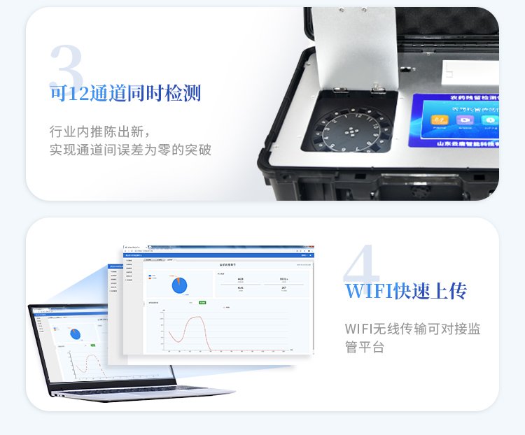 | 安卓智能操作系統(tǒng),采用更加**和人性化操作,儀器具有無線聯(lián)網(wǎng)上傳功能,快速上傳數(shù)據(jù),進行數(shù)據(jù)統(tǒng)計和分析。 | 智能化程度高,儀器具有自檢功能:具有開機自檢和調(diào)零功能,具有自動檢測重復(fù)性功能;同時,檢測完成可自動打印檢測報告和二維碼。手機掃碼可顯示出詳細檢測信息。 | 儀器帶有監(jiān)管平臺,數(shù)據(jù)可局域網(wǎng)和互聯(lián)網(wǎng)數(shù)據(jù)上傳,檢測結(jié)果直接傳至食品安全監(jiān)管平臺。進行區(qū)域食品安全監(jiān)管及大數(shù)據(jù)分析處理與數(shù)據(jù)統(tǒng)計,檢測區(qū)域食品安全長短期動態(tài),達到食品安全問題預(yù)估、預(yù)警 。 | 樣品處理簡單省力,整體操作快速、安全、便捷。 | 儀器具有自身保護功能,可設(shè)置用戶名及密碼,防止非工作人員操作等。 | 內(nèi)置強大的數(shù)據(jù)庫,可在儀器上直接選擇樣品名稱、檢測指標(biāo)、送檢單位等信息,也可在儀器上直接編輯錄入樣品名稱、檢測指標(biāo)、送檢單位等信息并保存進樣品數(shù)據(jù)庫,方便后期操作調(diào)取使用。 | 儀器具有重新校準(zhǔn)、鎖定、恢復(fù)出廠設(shè)置功能。 |