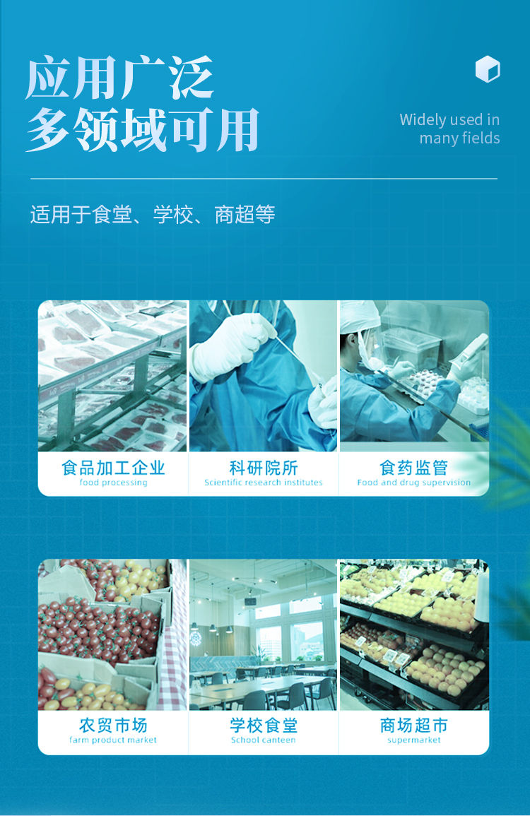 廣泛應(yīng)用于主要用于蔬菜、水果、茶葉、糧食、農(nóng)副產(chǎn)品等食品中有機(jī)磷和氨基甲酸酯類農(nóng)藥殘留的快速檢測(cè);此外還可用于果蔬茶生產(chǎn)基地和農(nóng)貿(mào)批發(fā)銷售市場(chǎng)現(xiàn)場(chǎng)檢測(cè),餐館、學(xué)校、食堂、家庭果蔬加工前的安全速測(cè)等。