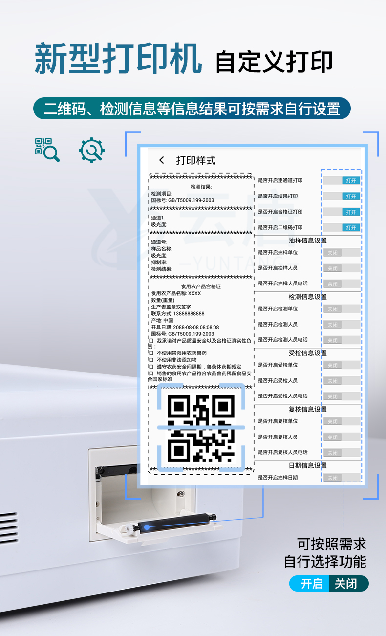 9.7.1、全新打印系統(tǒng):內(nèi)置全新打印機,新創(chuàng)自定義打印方式,可按需靈活勾選控制:產(chǎn)品合格證(國家農(nóng)業(yè)部標準要求),二維碼,抽樣信息、檢測信息,受檢信息、復(fù)核信息、抽樣日期、檢測日期等信息的打印。