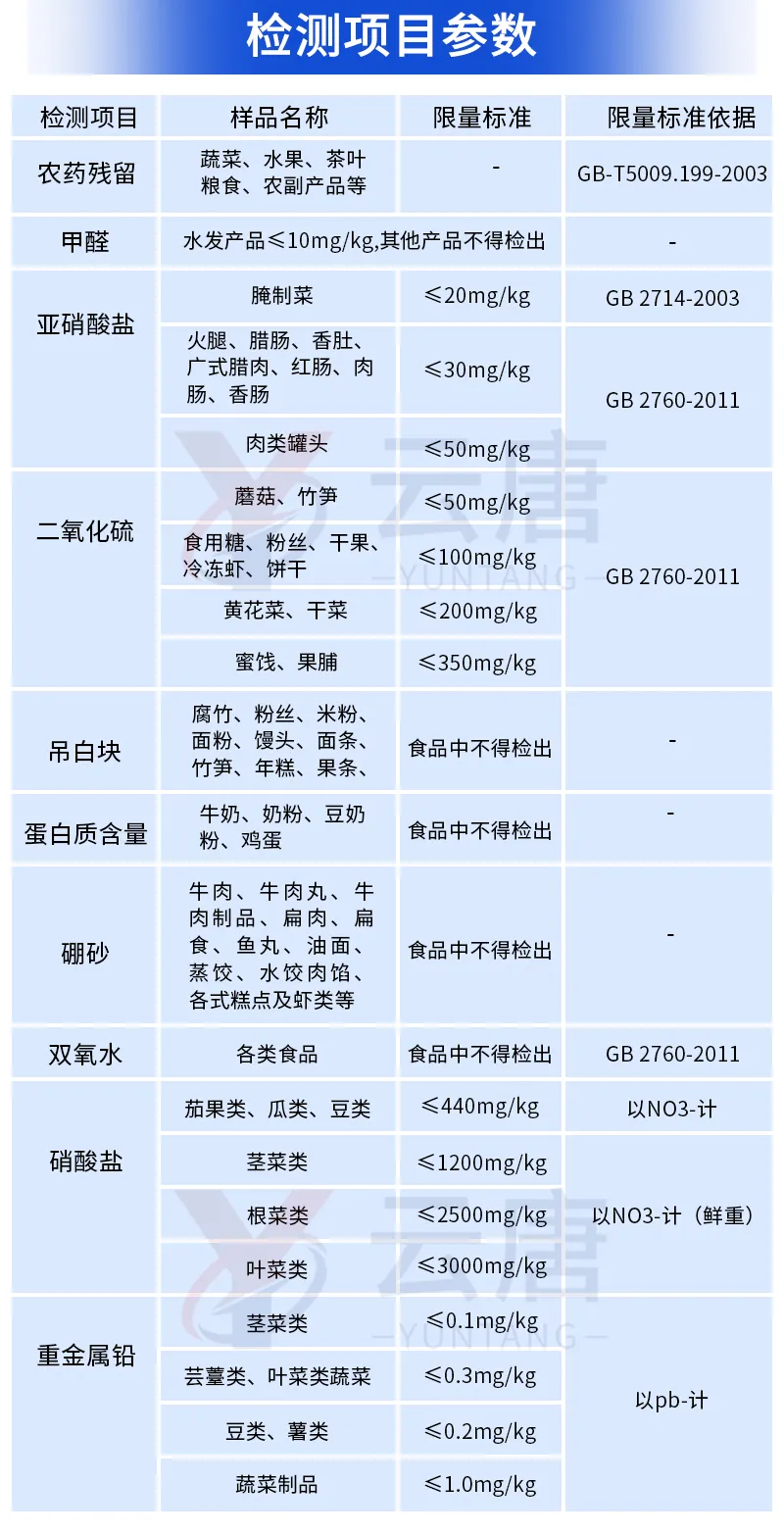 果蔬中:農(nóng)藥殘留,病害肉診斷:組胺、揮發(fā)性鹽基氮、肉制品酸價、水發(fā)產(chǎn)品中組胺