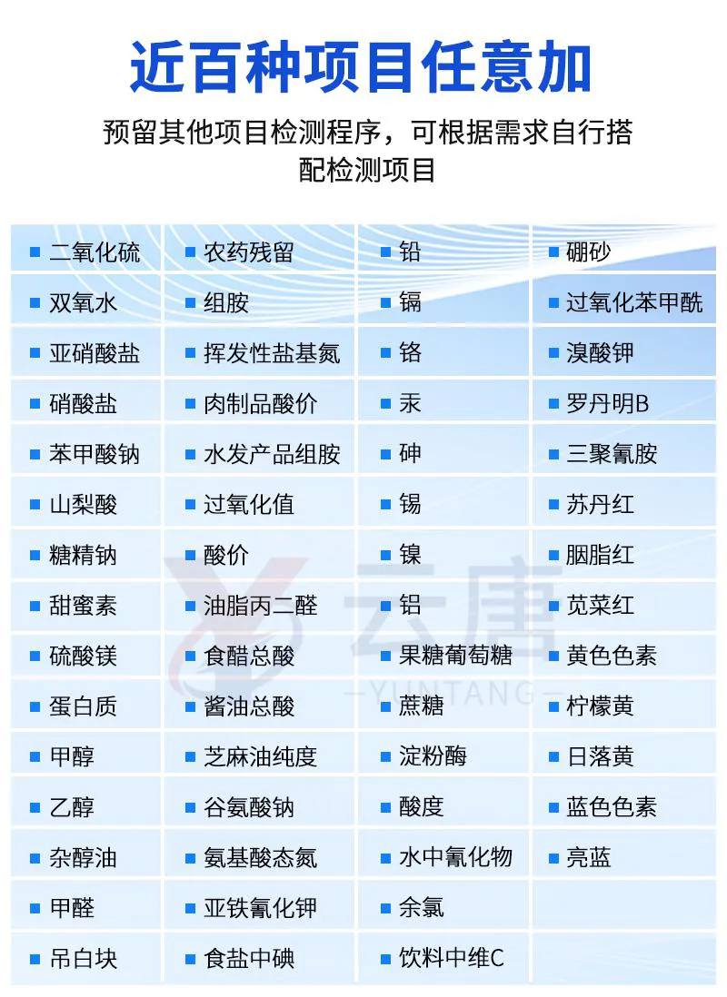 多功能食品安全檢測儀可快速檢測60多項目,包含非食用化學物質(zhì)、濫用食品添加劑、農(nóng)藥殘留、獸藥殘留、重金屬、病害肉、營養(yǎng)強化劑、抗生素類殘留、激素類殘留、真菌毒素類殘留、化學類殘留等現(xiàn)場的定性定量檢測。