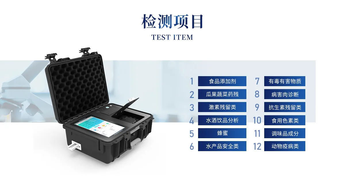 山東藍(lán)虹光電科技有限公司生產(chǎn)的高智能食品安全檢測儀可快速檢測200多種食品安全項(xiàng)目,包含非食用化學(xué)物質(zhì)、濫用食品添加劑、農(nóng)藥殘留、獸藥殘留、重金屬、病害肉、營養(yǎng)強(qiáng)化劑、抗生素類殘留、激素類殘留、真菌毒素類殘留、化學(xué)類殘留等項(xiàng)目的定性定量檢測。