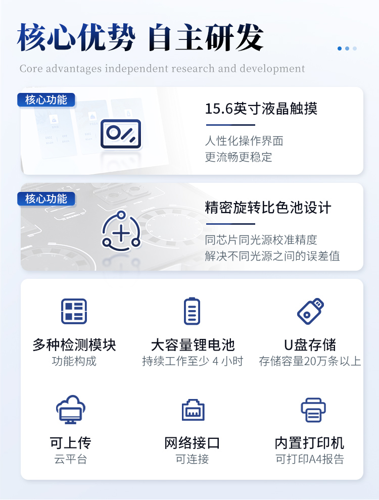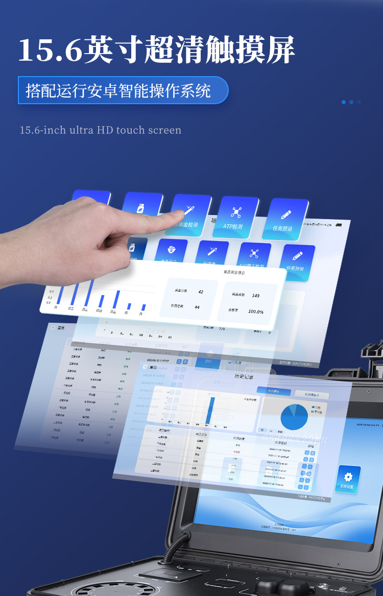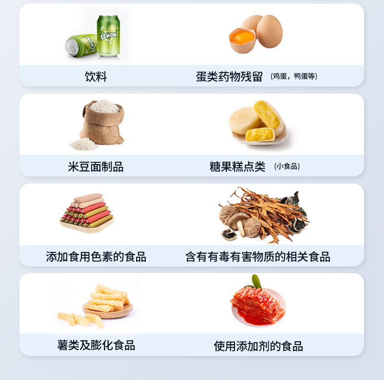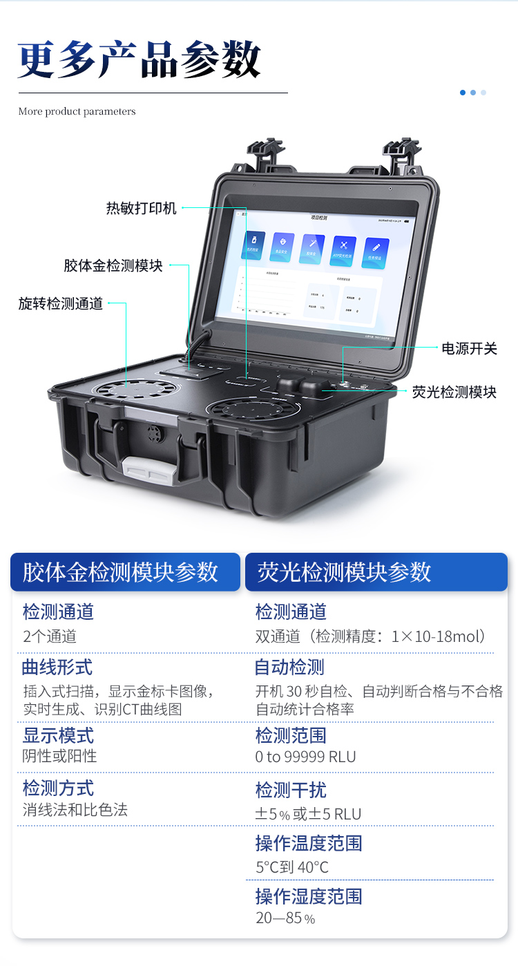 | 1. 功能構(gòu)成:主要包括分光光度模塊、新型農(nóng)殘檢測(cè)模塊、膠體金檢測(cè)模塊、熒光檢測(cè)模塊、數(shù)字化管理模塊等,所有模塊集成一體,可快速檢測(cè)200多種食品安全項(xiàng)目,如獸藥殘留、農(nóng)藥殘留、非法添加劑、細(xì)菌數(shù)值等指標(biāo)。 | 2. 檢測(cè)樣品種類(lèi):餐具及廚房用品、瓜果蔬菜及其制品、水產(chǎn)品及其制品、畜禽產(chǎn)品及其制品、嬰幼兒乳品及奶粉制品、蜂蜜、糧油及其制品、調(diào)味品(食醋、醬油、味精、鹽等)、酒類(lèi)茶葉及其制品、食用菌、飲料、蛋類(lèi)藥物殘留(雞蛋,鴨蛋等)、米豆面制品、糖果糕點(diǎn)類(lèi)(小食品)、薯類(lèi)及膨化食品、瓶(桶)裝飲用水、添加食用色素的食品、使用添加劑的食品、含有有毒有害物質(zhì)的相關(guān)食品。 | 3、顯示屏幕:儀器采用15.6英寸液晶觸摸屏顯,搭配運(yùn)行安卓智能操作系統(tǒng),主控芯片采用ARM Cortex-A7,RK3288/4核處理器,主頻1.88Ghz,操作方便,性能更強(qiáng)。 | 4、供電模式:儀器交直流兩用,直流12V供電,可連接車(chē)載電源,配18ah大容量充電鋰電池,電量可實(shí)時(shí)顯示,無(wú)外部電源條件下可持續(xù)工作至少 4 小時(shí)。 | 5、檢測(cè)通道:≥24通道;采用精密旋轉(zhuǎn)比色池設(shè)計(jì),使用同芯片同光源校準(zhǔn)精度,解決不同光源之間的誤差值,更加準(zhǔn)確**,采用高精度進(jìn)口四波長(zhǎng)冷光源,每個(gè)通道均配置 410、520、590、630nm 波長(zhǎng)光源,標(biāo)配**的光路切換裝置,專(zhuān)利光路切換功能可實(shí)現(xiàn)64波長(zhǎng),并且所有檢測(cè)項(xiàng)目可實(shí)現(xiàn)所有通道同時(shí)檢測(cè). | 6、通訊接口:配備無(wú)線(xiàn)通信模塊、4G(APN)通訊模塊、藍(lán)牙傳輸,同時(shí)具有雙USB接口以及RJ45網(wǎng)線(xiàn)接口,可以多方式實(shí)現(xiàn)數(shù)據(jù)保存及數(shù)據(jù)傳輸。 | 7、存儲(chǔ)方式:支持U盤(pán)存儲(chǔ),兩個(gè)標(biāo)準(zhǔn)USB接口,免驅(qū)動(dòng)安裝。檢測(cè)結(jié)果存儲(chǔ)容量20萬(wàn)條以上,可生成Excel表格進(jìn)行拷貝,并具有登錄保護(hù)功能。 | 8、操作系統(tǒng):儀器可在同一檢測(cè)界面自動(dòng)對(duì)應(yīng)相關(guān)檢測(cè)通道,一次性選擇不少于11個(gè)樣品名稱(chēng),無(wú)需退出界面,節(jié)省操作時(shí)間。并可以對(duì)每個(gè)通道屬性和樣品信息單獨(dú)進(jìn)行編輯,例如送檢單位、人員,檢測(cè)人員等,打印時(shí)勾選打印顯示。 | 9、數(shù)據(jù)集成系統(tǒng):設(shè)備首頁(yè)自動(dòng)匯總分析檢測(cè)數(shù)據(jù),包含:周檢測(cè)數(shù)據(jù)、月檢測(cè)數(shù)據(jù),全部檢測(cè)總數(shù)量,包含檢測(cè)總數(shù),合格數(shù),不合格數(shù),以及相關(guān)柱形分析圖,各項(xiàng)檢測(cè)數(shù)據(jù)一目了然,無(wú)需電腦查詢(xún),更加快捷直觀。 | 10、數(shù)據(jù)庫(kù)系統(tǒng):十幾項(xiàng)數(shù)據(jù)庫(kù)分類(lèi)管理儀器:包含項(xiàng)目類(lèi)型、項(xiàng)目數(shù)據(jù)、檢測(cè)數(shù)據(jù)、歷史記錄、國(guó)標(biāo)信息、曲線(xiàn)信息、采樣信息、檢測(cè)信息、受檢信息、復(fù)核信息、圖表信息、光源校準(zhǔn)信息、打印樣式信息、樣品庫(kù)信息等等,數(shù)據(jù)庫(kù)之間互相協(xié)調(diào)聯(lián)動(dòng)保證數(shù)據(jù)的真實(shí)完整性。同時(shí)產(chǎn)品數(shù)據(jù)庫(kù)以及歷史檢測(cè)記錄支持一鍵檢索功能。 | 11、限量規(guī)判系統(tǒng):具有限量查詢(xún)、添加物質(zhì)合規(guī)判定系統(tǒng)。檢測(cè)出結(jié)果后,系統(tǒng)自動(dòng)調(diào)用系統(tǒng)數(shù)據(jù)庫(kù)中相關(guān)國(guó)標(biāo)進(jìn)行比對(duì)判定,客觀顯示判定結(jié)果是否合格。 | 12、項(xiàng)目預(yù)設(shè)系統(tǒng):儀器具有任務(wù)預(yù)設(shè)模塊,一鍵提前預(yù)設(shè),給出方便快捷的新檢測(cè)方案,每一個(gè)任務(wù)分別可以設(shè)置不同的樣品、批次、編號(hào)、來(lái)源、備注、抽樣信息、檢測(cè)信息、受檢信息、復(fù)核信息等更多信息。樣品送檢時(shí)一鍵調(diào)取保存信息,并可多次調(diào)取,適用于大批量檢測(cè)業(yè)務(wù),可以大大提高檢測(cè)效率。 | 13、數(shù)據(jù)監(jiān)管系統(tǒng):同步對(duì)接監(jiān)管平臺(tái),數(shù)據(jù)可局域網(wǎng)和互聯(lián)網(wǎng)數(shù)據(jù)上傳,檢測(cè)結(jié)果可直接傳至食品安全監(jiān)管平臺(tái)。進(jìn)行區(qū)域食品安全監(jiān)管及大數(shù)據(jù)分析處理與數(shù)據(jù)統(tǒng)計(jì),監(jiān)測(cè)區(qū)域食品安全長(zhǎng)短期動(dòng)態(tài)及問(wèn)題預(yù)估、預(yù)警。 | 14.1、全新打印系統(tǒng):內(nèi)置全新打印機(jī),新創(chuàng)自定義打印方式,可按需靈活勾選控制:產(chǎn)品合格證(國(guó)家農(nóng)業(yè)部標(biāo)準(zhǔn)要求),二維碼,抽樣信息、檢測(cè)信息,受檢信息、復(fù)核信息、抽樣日期、檢測(cè)日期等信息的打印。 | 14.2、A4紙版本報(bào)告打印功能:設(shè)備擁有兩種結(jié)果展示方式,可以自動(dòng)生成A4打印模板和小票打印模板兩種樣式,可通過(guò)WiFi及網(wǎng)線(xiàn)等方式連接外置打印機(jī)可進(jìn)行打印。 | 15、膠體金檢測(cè)模塊:采用單通道CMOS成像處