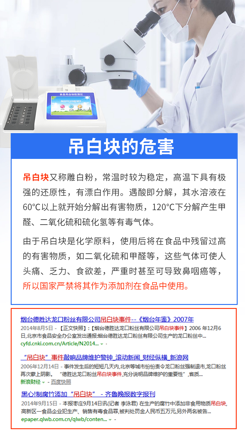 1、 檢測(cè)項(xiàng)目:用于快速檢測(cè)食品中吊白塊,儀器預(yù)留其他項(xiàng)目檢測(cè)程序和端口,根據(jù)日后需求可方便的自主增加檢測(cè)項(xiàng)目。日后可升級(jí)為檢測(cè),水產(chǎn)品,肉制品,面制品的綜合類型儀器。