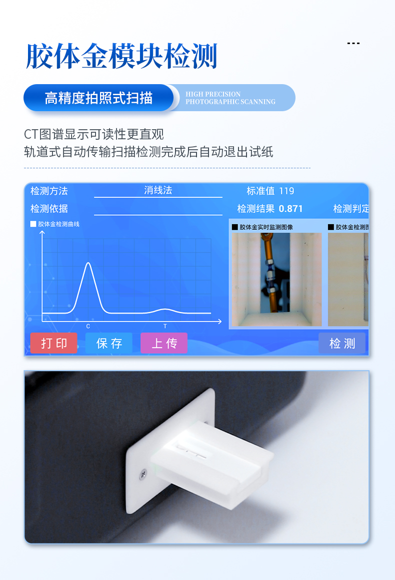 8、膠體金模塊檢測(cè)方式:軌道式自動(dòng)傳輸掃描,檢測(cè)完成后自動(dòng)退出檢測(cè)卡。