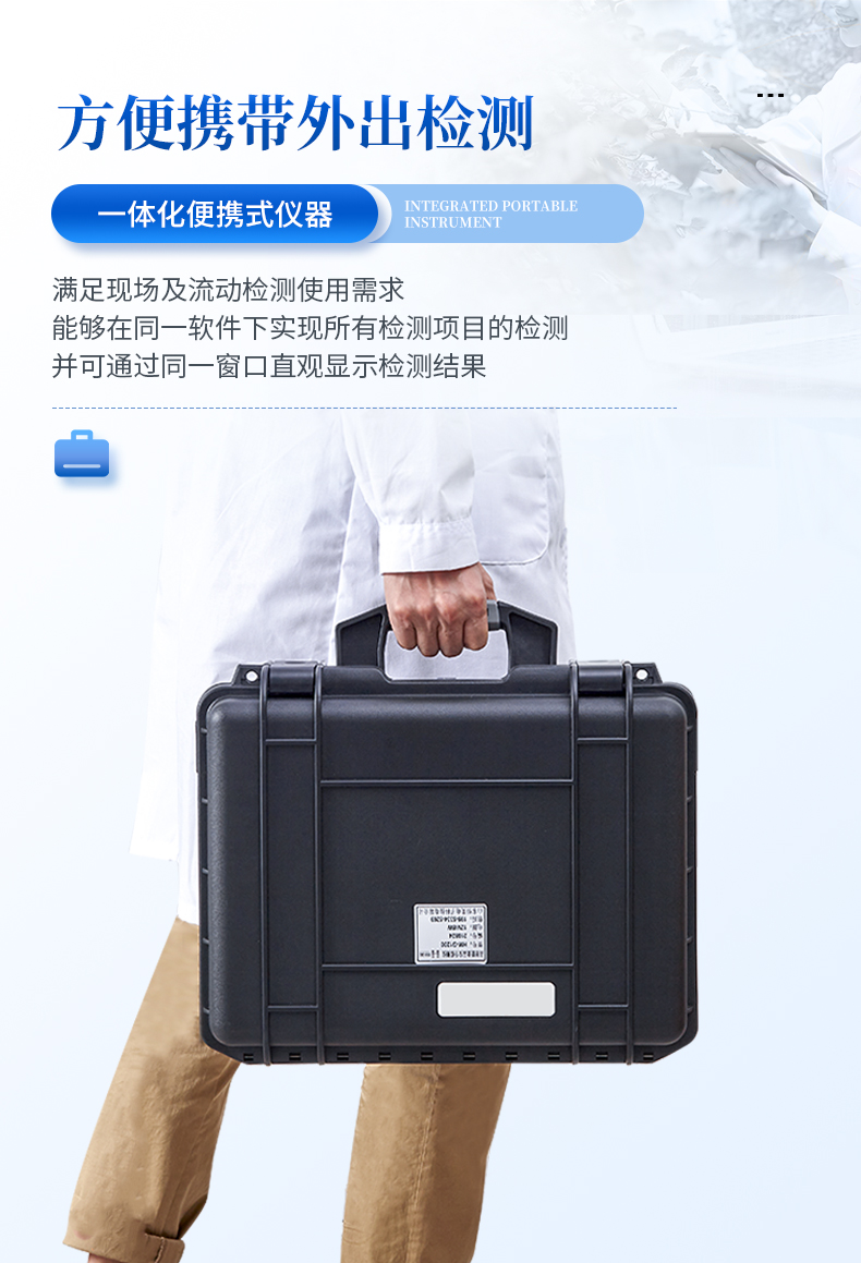 7、一體化便攜式快檢設(shè)備,滿足現(xiàn)場(chǎng)及流動(dòng)檢測(cè)使用需求,能夠在同一軟件下實(shí)現(xiàn)所有檢測(cè)項(xiàng)目的檢測(cè),并可通過(guò)同一窗口直觀顯示檢測(cè)結(jié)果。