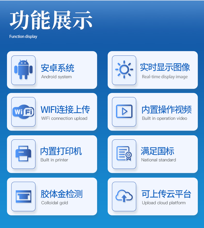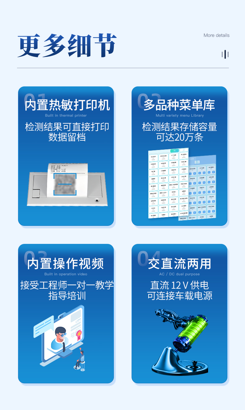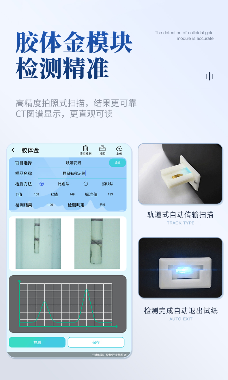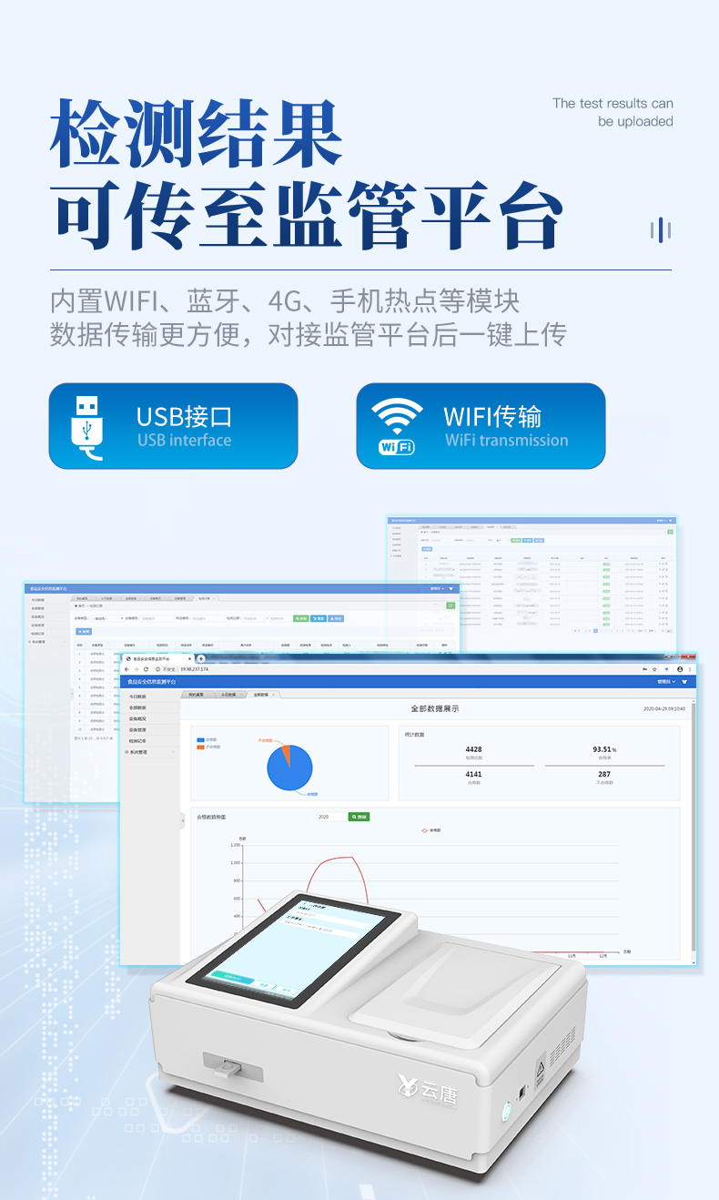 | 儀器采用10.1英寸液晶觸摸屏顯,搭配運行安卓智能操作系統(tǒng),主控芯片采用ARM Cortex-A7,RK3288/4核處理器,主頻1.88Ghz,運轉速度更快速,性能更強。 | 儀器功能包括:膠體金檢測模塊、數(shù)字化管理模塊、無線通訊模塊等,可以滿足同一軟件下實現(xiàn)所有檢測項目的檢測,并在同一窗口展示檢測結果。 | 一體化便攜式快檢設備,采用交直流兩用供電方式,可連接車載電源,配備6ah大容量充電鋰電池,可以滿足現(xiàn)場及流動檢測使用的需求。儀器尺寸:43×35×20cm, 主機凈重:5.1kg | 系統(tǒng)自帶數(shù)據(jù)集成模塊,設備首頁自動統(tǒng)計檢測數(shù)據(jù)包含:周檢測數(shù)據(jù)、月檢測數(shù)據(jù),全部檢測總數(shù)量,均包含檢測總數(shù),合格數(shù),不合格數(shù),以及相關柱形分析圖,對各項檢測數(shù)據(jù)清晰掌握,無需電腦查詢,更加快捷直觀。 | 儀器具有任務預設模塊,可在樣品送檢前提前預設樣品名稱、檢測指標、送檢單位等信息,樣品送檢時一鍵調取保存信息,檢測更加方便快捷。 | 膠體金檢測模塊: 直插式自動掃描方式,可實時顯示金標卡實時圖像,系統(tǒng)自動分析并呈現(xiàn)出CT曲線圖,CT線自動識別,無需手動調整,完成檢測后自動退出檢測卡。 結果判定線可修改,對照值標定值可保存,斷電不丟失數(shù)據(jù)。 兼容市場上其他膠體金卡,使用耗材不受限制,極大增強用戶使用體驗。 | 儀器檢測系統(tǒng)擁有龐大數(shù)據(jù)庫,并且構建了完善的檢索、修訂功能。食品庫涵蓋多種樣品名稱,可按需添加或刪除、編輯樣品名稱;產(chǎn)品數(shù)據(jù)庫以及歷史檢測記錄支持一鍵檢索功能。 | 系統(tǒng)打印自定義化,打印格式多樣化,產(chǎn)品合格證(國家標準要求),二維碼,抽樣信息、檢測信息,受檢信息、復核信息、抽樣日期、檢測日期等信息結果,可按需求自行設置打印內(nèi)容。 | A4紙版本報告打印功能(可選配):設備擁有兩種結果展示方式,可以自動生成A4打印模板和小票打印模板兩種樣式,可通過WiFi及網(wǎng)線等方式鏈接外置打印機可進行打印 | 儀器具有 wifi 聯(lián)網(wǎng)上傳、RJ45網(wǎng)線連接功能,可以快速上傳數(shù)據(jù)。同步對接監(jiān)管平臺,數(shù)據(jù)可局域網(wǎng)和互聯(lián)網(wǎng)數(shù)據(jù)上傳,檢測結果直接傳至食品安全監(jiān)管平臺。進行區(qū)域食品安全監(jiān)管及大數(shù)據(jù)分析處理與數(shù)據(jù)統(tǒng)計,檢測區(qū)域食品安全長短期動態(tài),達到食品安全問題預估、預警。 | 設備支持U盤存儲,標準USB接口,免驅動安裝。檢測結果存儲容量20萬條以上,可生成Excel表格,進行一鍵拷貝,并具有登錄保護功能,可設置用戶名及密碼,規(guī)范不同人員操作權限,防止非工作人員操作,并且可以進行重新校準、鎖定、恢復出廠設置功能。儀器固件可升級,后期檢測項目可擴充。 | 儀器具備遠程升級功能,可定向分客戶分儀器更新,開機后自動更新,并可持續(xù)性免費更新系統(tǒng)版本,無需像傳統(tǒng)產(chǎn)品返廠更新,節(jié)省時間及人力成本并避免了物流運輸返廠升級導致設備損壞的潛在風險。 |