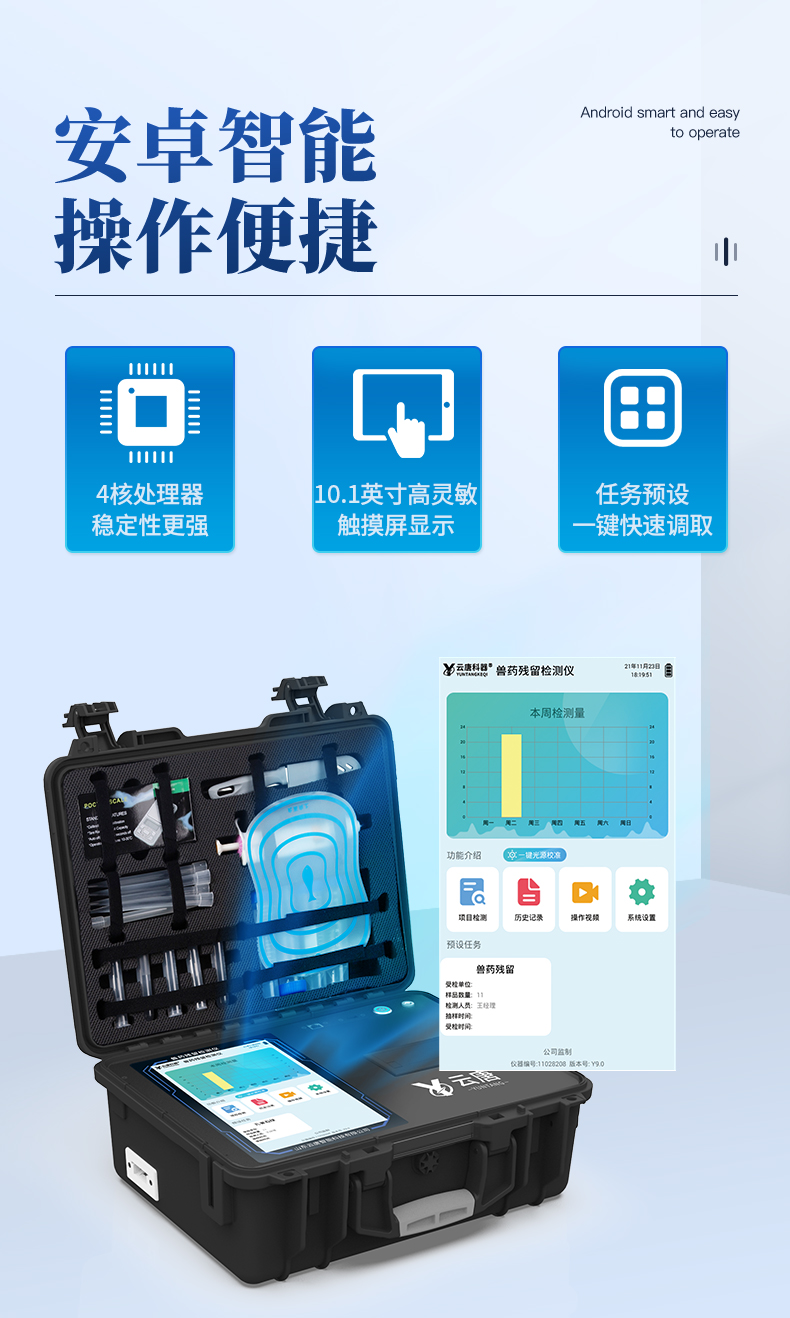 山東云唐智能科技有限公司生產(chǎn)的高智能獸藥殘留檢測儀可快速檢測瘦肉精激素類食品安全項目,包含鹽酸克倫特羅、沙丁胺醇、萊克多巴胺、己烯雌酚,獸藥殘留、抗生素類殘留、真菌毒素類殘留、動物疫病類等檢測