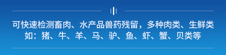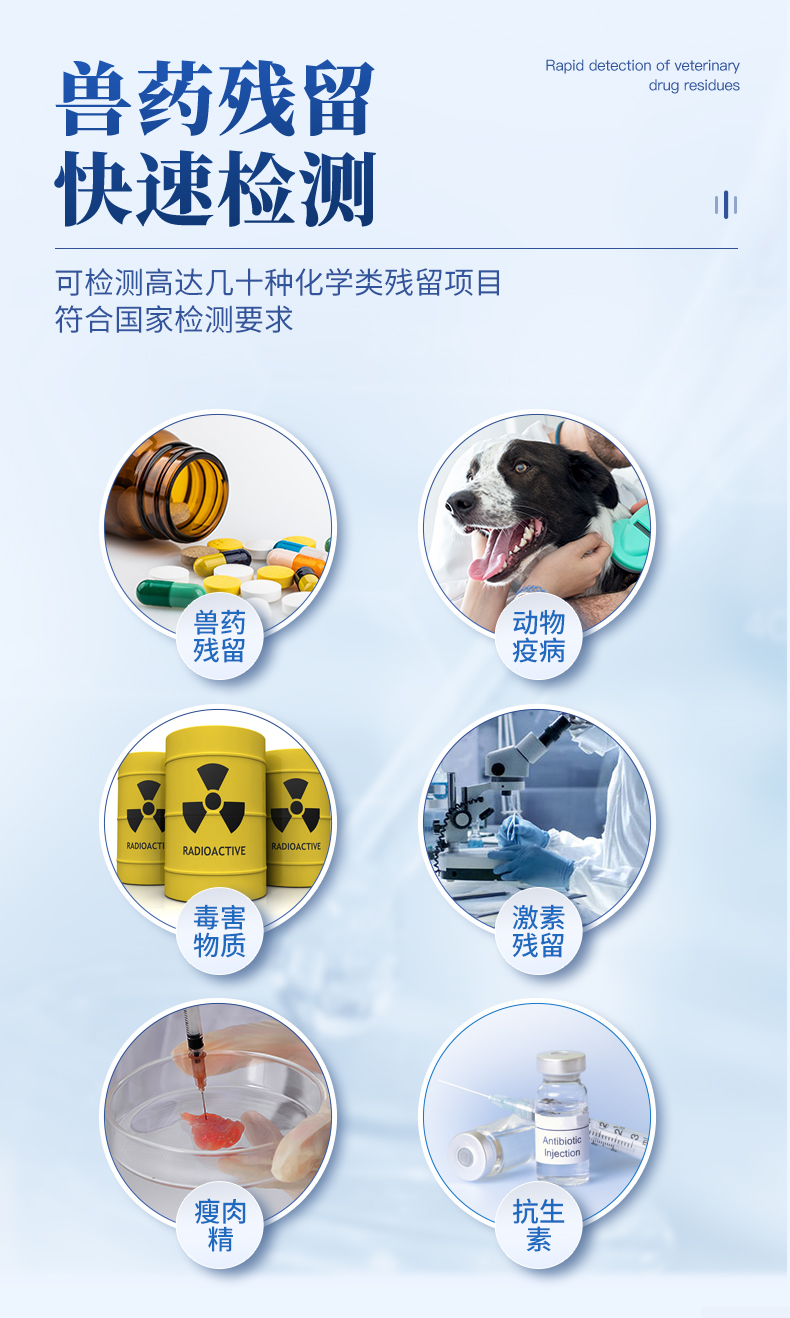| 瘦肉精激素:鹽酸克倫特羅、沙丁胺醇、萊克多巴胺、己烯雌酚等 | 抗生素殘留:四環(huán)素類、硝基呋喃類、磺胺類、β-興奮劑類、沙星類、磺胺類、喹諾酮類,甲砜霉素,氟苯尼考,金剛烷胺、替米考星、慶大霉素、林可霉素、鏈霉素、恩諾沙星、環(huán)丙沙星、頭孢啦啶、青霉素、阿莫西林等 | 水產(chǎn)品安全類:孔雀石綠、氯霉素、呋喃妥因、呋喃西林、呋喃它酮、呋喃唑酮等 | 蛋類藥物殘留:氯霉素,四環(huán)素,磺胺類,喹諾酮類,呋喃西林,呋喃它酮,呋喃妥因,呋喃唑酮,氟苯尼考,阿莫西林、頭孢氨芐、紅霉素、鏈霉素等 | 動物疫病類:禽流感、新城疫、牛羊口蹄疫、牛羊結核病、牛羊包蟲、牛羊布病、小反芻獸、豬藍耳病毒、豬瘟病毒、豬偽狂犬病毒、豬細小、豬圓環(huán)、犬細小病毒、犬瘟熱病毒、犬狂犬病毒等 | 真菌毒素殘留:食用油、糧食及飼料中黃曲霉毒素B1、黃曲霉毒素總量,奶中黃曲霉毒素M1、嘔吐毒素、玉米赤霉烯酮、赭曲霉毒素A、T2毒素、伏馬毒素等 |