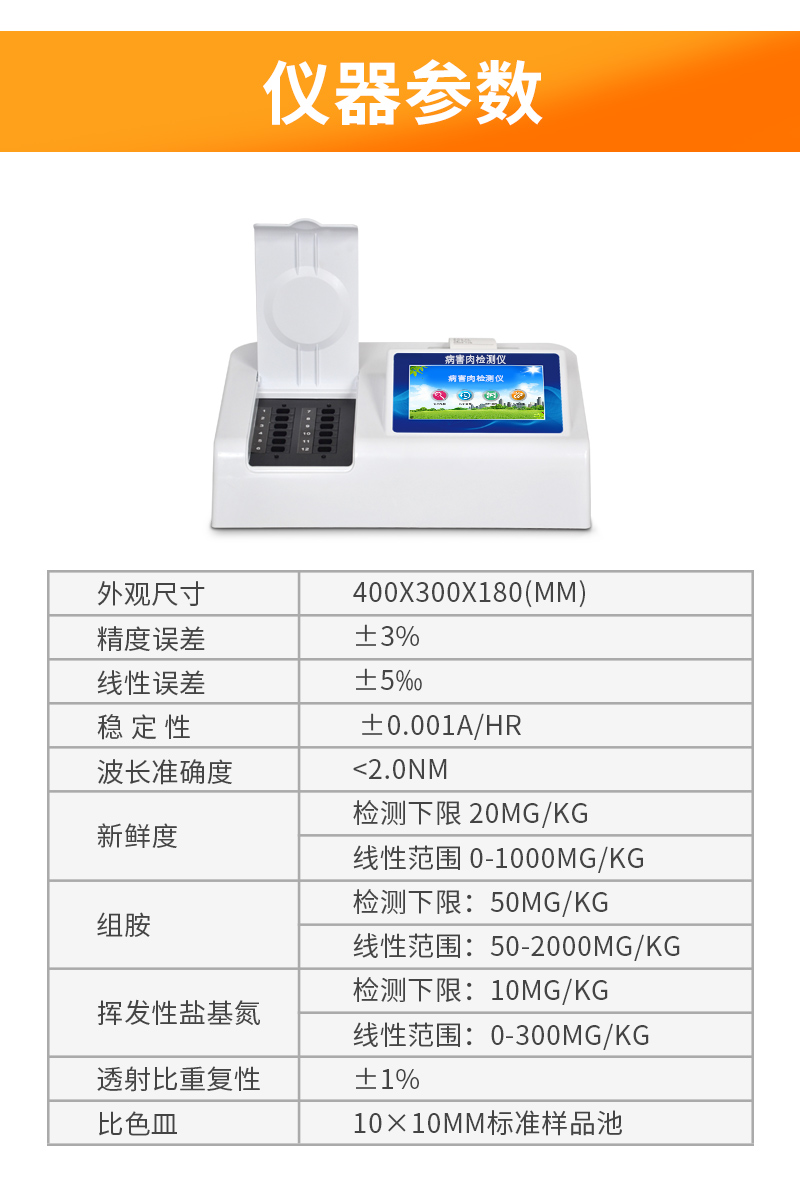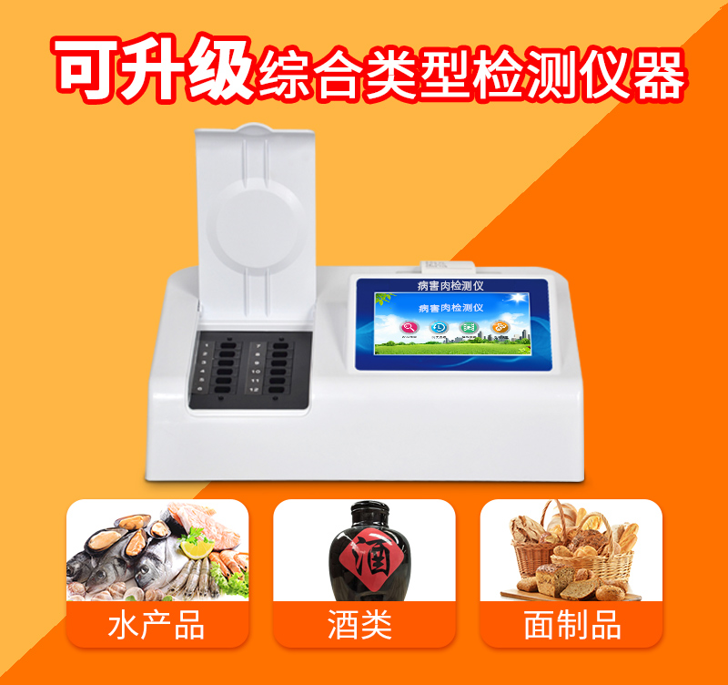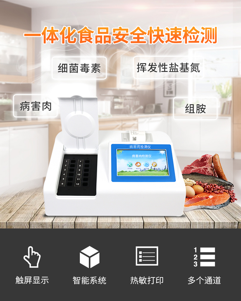 可快速檢測病害肉、組胺、揮發(fā)性鹽基氮,儀器預(yù)留其他項目檢測程序和端口,根據(jù)日后需求可方便的自主增加檢測項目。