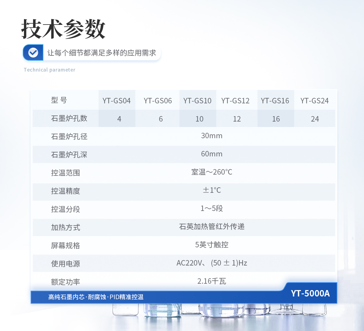 | 石墨爐孔:孔徑30mm,孔深60mm,孔數(shù)3×2 | 控溫范圍:室溫~260℃ | 控溫精度:±1℃ | 控溫分段:1~5段 | 加熱方式:石英加熱管紅外傳遞 | 屏幕規(guī)格:5寸觸控 | 主機(jī)外型尺寸:寬432mm×深371mm×高168mm | 使用電源:AC220V、 (50 ± 1)Hz | 額定功率:1.2千瓦 |