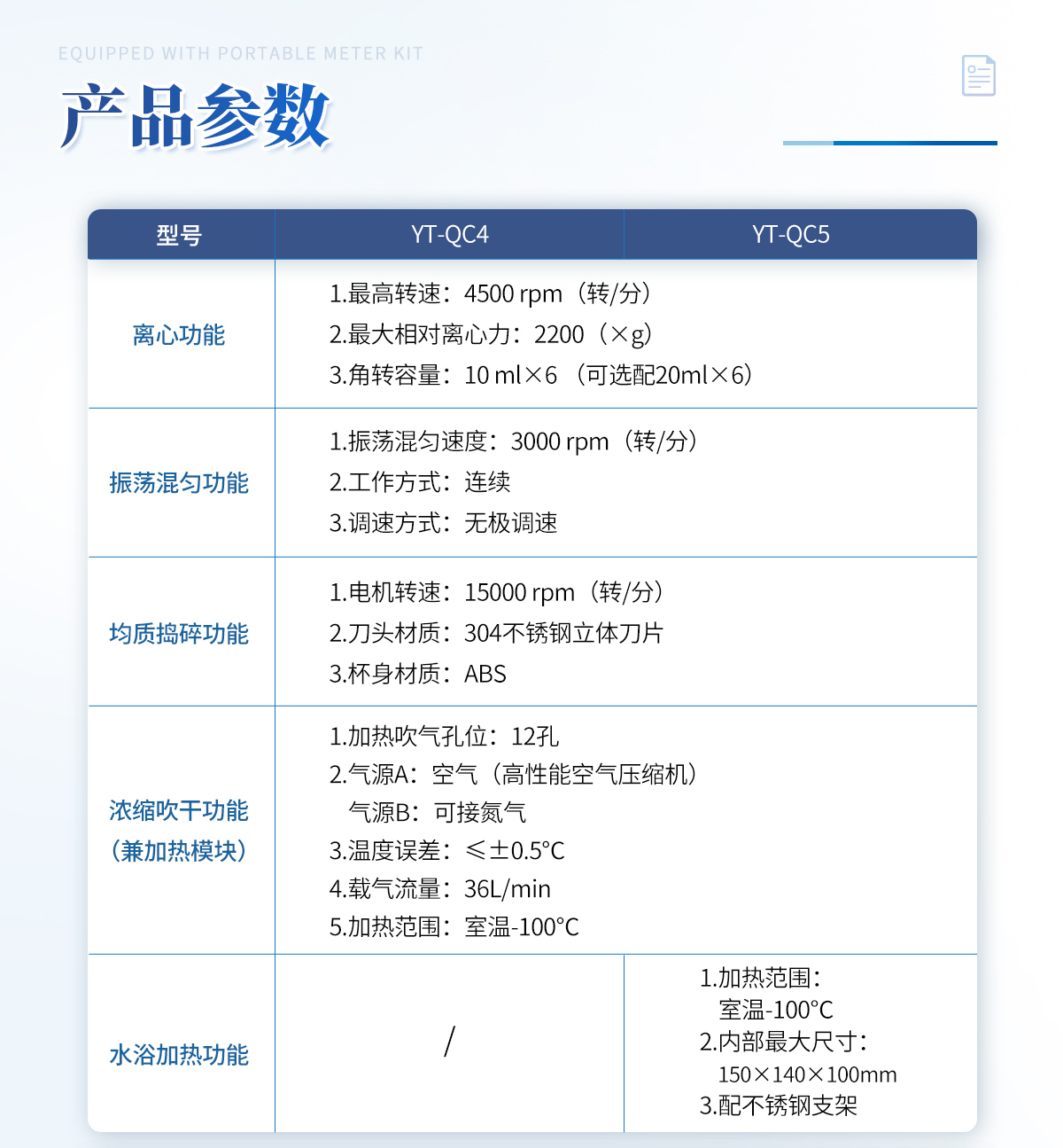 | 離心功能 1.**轉(zhuǎn)速:4500 rpm(轉(zhuǎn)/分) 2.**相對離心力:2200(×g) 3.角轉(zhuǎn)容量:10 mlx6 (可選配20mlx6) | 振蕩混勻功能 1.振蕩混勻速度:3000 rpm(轉(zhuǎn)/分) 2.工作方式:連續(xù) 3.調(diào)速方式:無極調(diào)速 | 均質(zhì)搗碎功能 1.電機(jī)轉(zhuǎn)速:15000 rpm(轉(zhuǎn)/分) 2.刀頭材質(zhì):304不銹鋼立體刀片 3.杯身材質(zhì):ABS | 濃縮吹干功能(兼加熱模塊) 1.加熱吹氣孔位: 12孔 2.氣源A: 空氣(高性能空氣壓縮機(jī)) 氣源B: 可接氮氣 3.溫度誤差:≤±0.5℃ 4.載氣流量:36L/min 5.加熱范圍:室溫-100℃ | 水浴加熱 1.加熱范圍:室溫-100℃ 2.內(nèi)部**尺寸:150mmX140mmX100mm 3.配不銹鋼支架 |