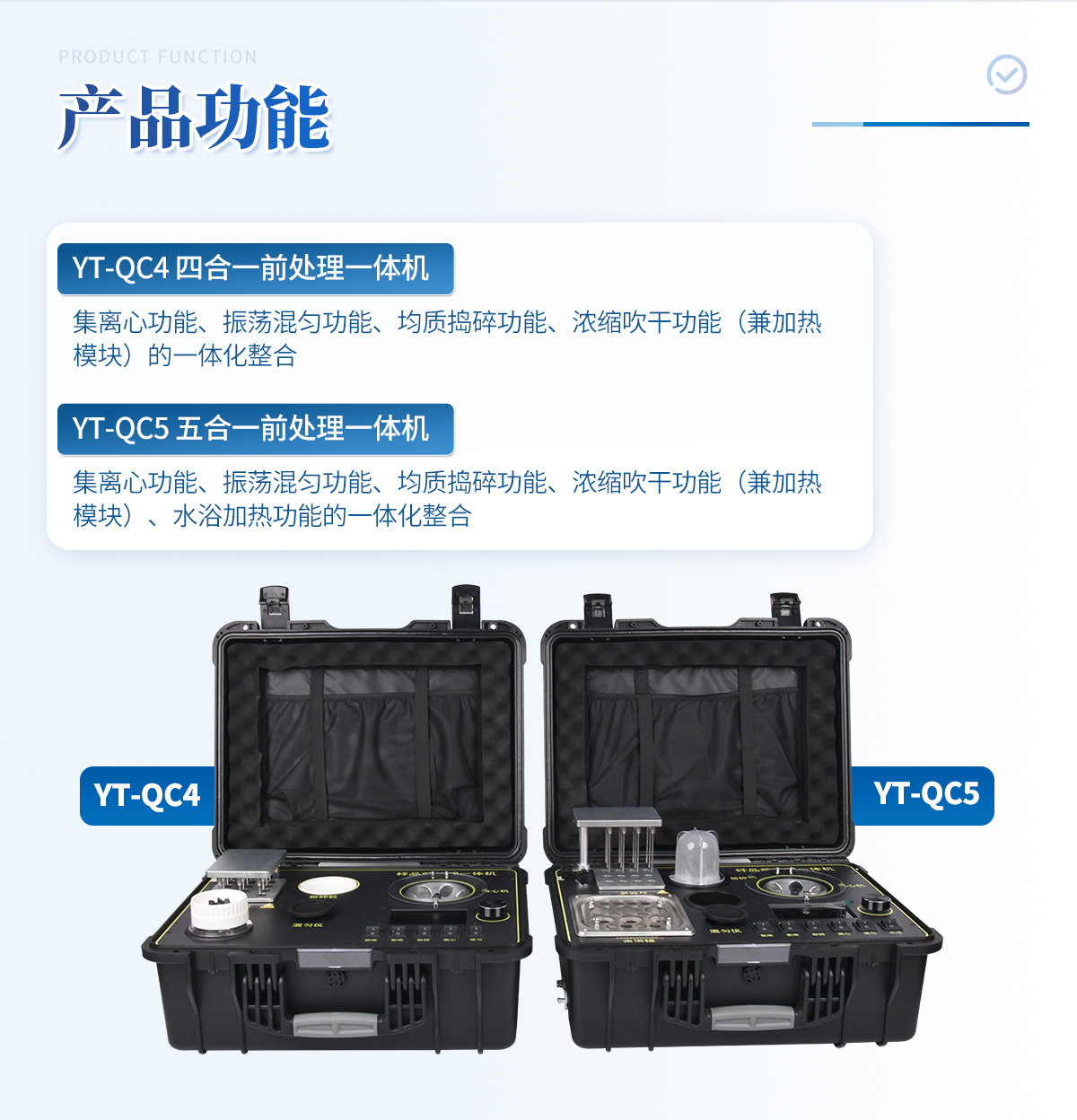 | 1、功能緊湊,集成五種樣品前處理常用的功能,完成樣品一站式處理。 | 2、結(jié)構(gòu)穩(wěn)固,機(jī)箱采用***工程塑料,具備**的抗沖擊性、耐腐蝕性、便攜性。 | 3、操作穩(wěn)定,機(jī)器采用五寸全彩色液晶屏,功能指示性強(qiáng),用戶操作均為實體開關(guān),杜絕佩戴手套和液體噴濺時的操作失效。 |
