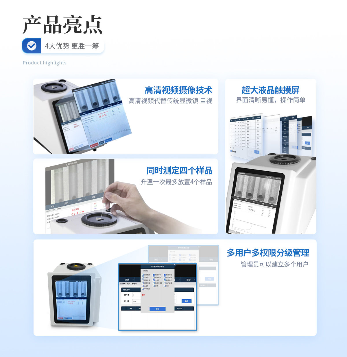 | 1、自動(dòng)化集成,實(shí)現(xiàn)一鍵測定功能; | 2、一次處理4個(gè)樣品; | 3、高清視頻代替?zhèn)鹘y(tǒng)顯微鏡 目視高; | 4、全自動(dòng)記錄熔程,初熔,終熔; | 5、可通過打印機(jī)直接打印數(shù)據(jù); | 6、符合21CFR Part 11、審計(jì)追蹤、藥典及電子簽名; | 7、符合GLP要求規(guī)范。 |