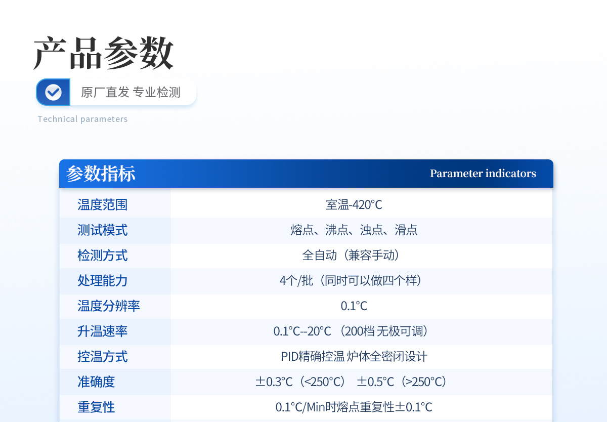 | 熔點(diǎn)儀在化學(xué)工業(yè)、醫(yī)藥研究中據(jù)有重要地位,是生產(chǎn)食品、藥物、香料、染料及其他有機(jī)晶體物質(zhì)的必備儀器。 |