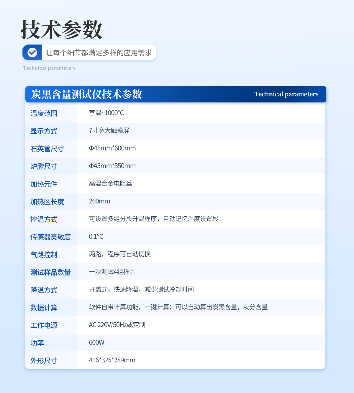 | 1.溫度范圍:室溫~1000℃ | 2. 顯示方式:7寸寬大觸摸屏 | 3.石英管尺寸:Ф45mm*600mm | 4. 爐膛尺寸:Φ45mm*350mm | 5.加熱元件:高溫合金電阻絲 | 6.加熱區(qū)長(zhǎng)度:260mm | 7.控溫方式:可設(shè)置多組分段升溫程序,自動(dòng)記憶溫度設(shè)置段 | 8. 傳感器靈敏度:0.1℃ | 9.氣路控制:兩路,程序可自動(dòng)切換 | 10. 測(cè)試樣品數(shù)量:一次測(cè)試4組樣品 | 11.降溫方式:開(kāi)蓋式,快速降溫,減少測(cè)試?yán)鋮s時(shí)間 | 12.數(shù)據(jù)計(jì)算:軟件自帶計(jì)算功能,一鍵計(jì)算;可以自動(dòng)算出炭黑含量,灰分含量 | 13.工作電源 AC:220V/50Hz或定制 | 14.功率:600W | 15.外形尺寸:416*325*289mm |