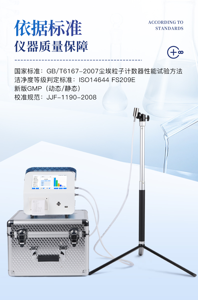 國家標(biāo)準(zhǔn):GB/T6167-2007塵埃粒子計(jì)數(shù)器性能試驗(yàn)方法 潔凈度等級判定標(biāo)準(zhǔn):ISO14644 FS209E ,新版GMP(動態(tài)/靜態(tài)) 校準(zhǔn)規(guī)范:JJF-1190-2008