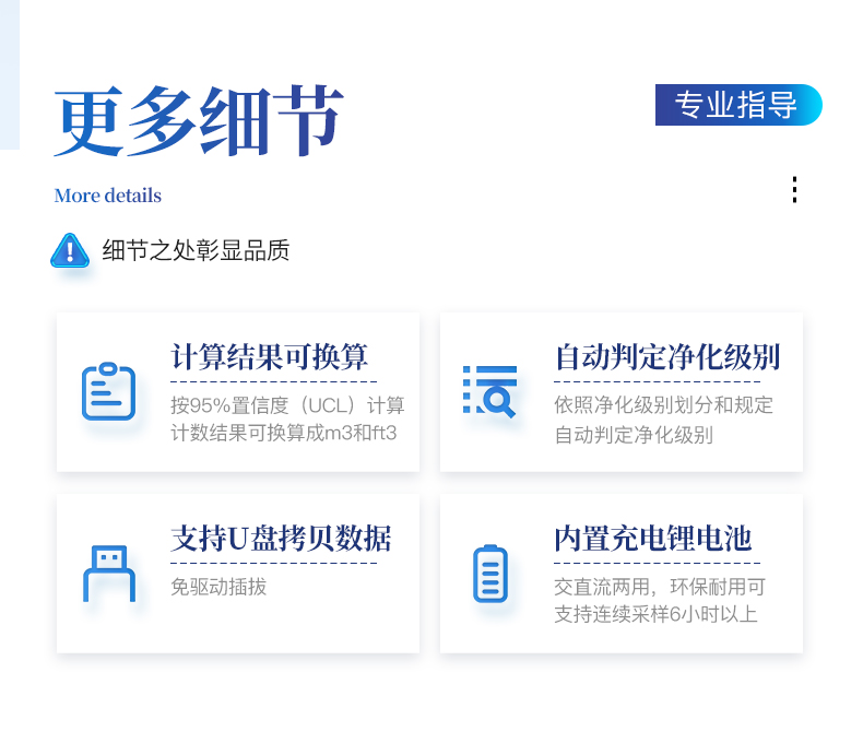 1、安卓系統(tǒng)7.1版本,操作交互體驗(yàn)更好。 2、內(nèi)置溫濕度傳感器、環(huán)境氣壓傳感器 3、核心部件光散射傳感器明顯消除腔體的雜散光,信噪比大為提高。從而使測量更準(zhǔn)確更可靠。 4、按95%置信度(UCL)計(jì)算,計(jì)數(shù)結(jié)果可換算成m3和ft3 5、依照凈化級別劃分和規(guī)定,自動判定凈化級別,使用便利。 6、支持wifi、藍(lán)牙傳輸,數(shù)據(jù)可無線上傳;同時(shí)支持U盤拷貝數(shù)據(jù),免驅(qū)動插拔。 7、配置監(jiān)管平臺,檢測結(jié)果可直接無線傳至平臺,進(jìn)行潔凈度長短期分析,輔助管理。 8、內(nèi)置新一代高速熱敏打印機(jī),可選擇所需要打印的粒徑通道,靈活打印結(jié)果。 9、交直流兩用,內(nèi)置充電鋰電池,環(huán)保耐用可支持連續(xù)采樣6小時(shí)以上。 10、便捷簡易伸縮式云臺支架,安裝采樣操作更加方便。