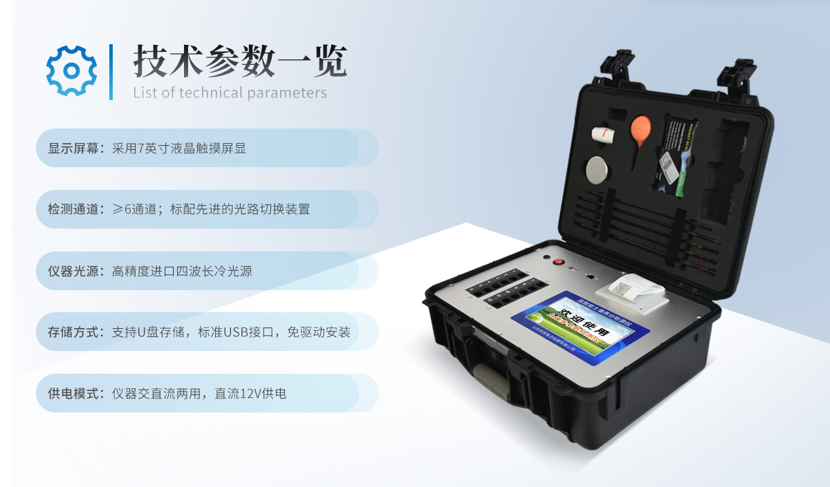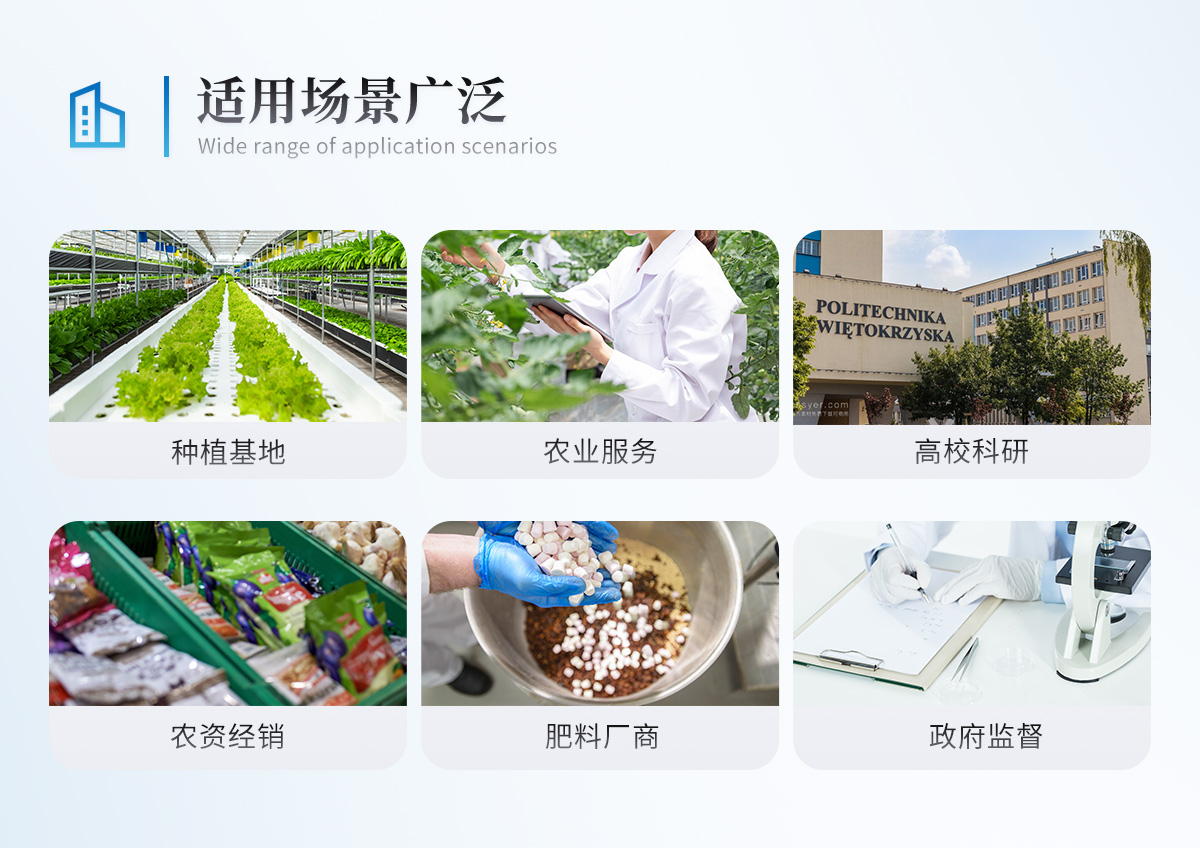 配套齊全:該儀器集藥、器、儀為一體,攜帶方便,相當于一個小型移動實驗室,無需用戶自配附件,亦可靈活野外流動測試。適于農(nóng)業(yè)服務部門或農(nóng)資經(jīng)銷商、合作社、肥料廠商、大種植戶測土施肥。