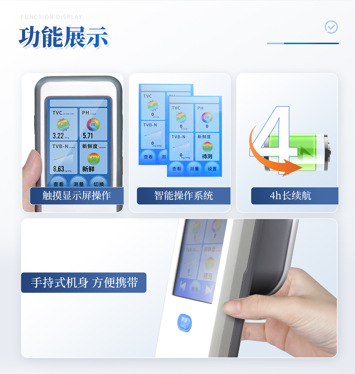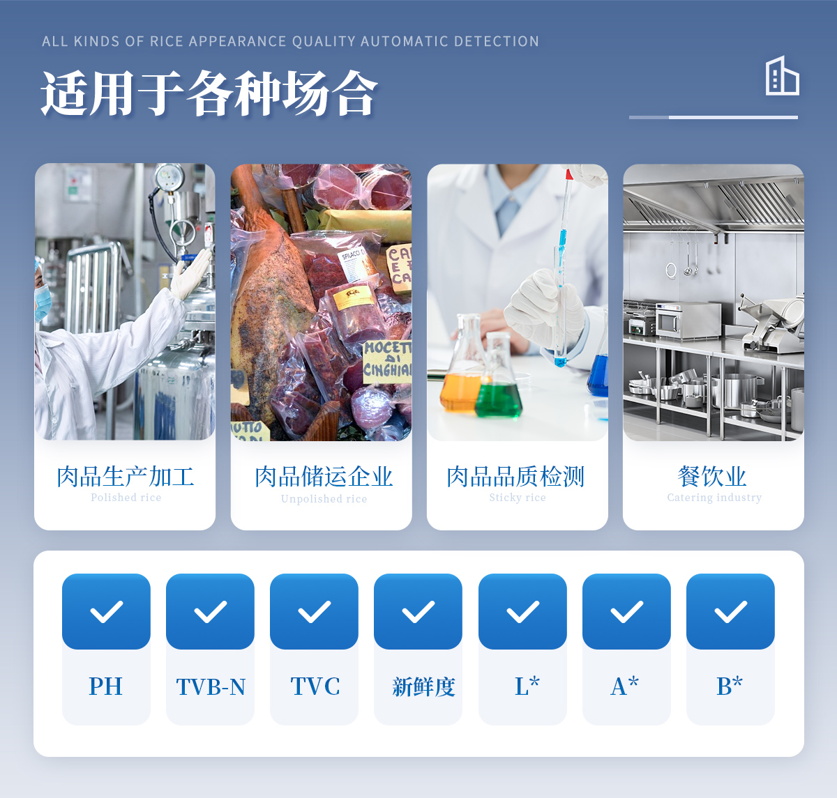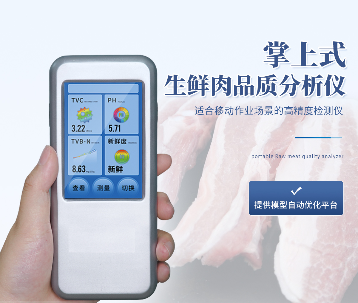 聯(lián)合中國農(nóng)業(yè)大學彭彥昆教授團隊研發(fā)的掌上式生鮮肉新鮮度分析儀,可用于檢測生鮮肉的TVC、pH、TVB-N、新鮮度、L*、A*、B*等評價指標。Palmarter具有體積小、便 于攜帶、性價比高等特點,其應用場景包括但不限于肉儲運企業(yè)、肉品品質(zhì)監(jiān)管部門、飯店、超市、菜場、家庭等。