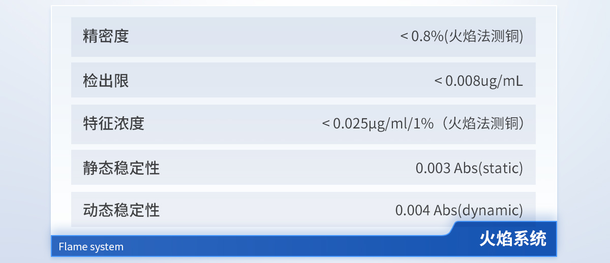 整機(jī)單色器類型:切爾尼-特納型(Czerny-Turner) 波長(zhǎng)范圍:190nm~900nm 波長(zhǎng)準(zhǔn)確度:±0.25nm 波長(zhǎng)重復(fù)性:< 0.05nm 光譜帶寬:0.1/0.2/0.4/0.7/1.4 nm 五檔自動(dòng)切換 火焰系統(tǒng) 精密度:< 0.8%(火焰法測(cè)銅) 檢出限:< 0.008ug/mL 特征濃度:< 0.025μg/ml/1%(火焰法測(cè)銅) 靜態(tài)穩(wěn)定性: 0.003 Abs(static) 動(dòng)態(tài)穩(wěn)定性: 0.004 Abs(dynamic) 石墨爐系統(tǒng) 石墨爐控溫范圍:室溫--3000℃ 石墨爐升溫速率:3000℃/s 石墨爐測(cè)鎘(Cd)精密度:≤ 2% 石墨爐測(cè)鎘(Cd)精密度:≤ 5% 石墨爐測(cè)鎘(Cd)特征量:≤ 0.5pg 石墨爐測(cè)鎘(Cd)檢出限:≤ 1pg 石墨爐測(cè)鎘(Cd)檢出限:≤ 2pg 電源:220V±22V,50Hz±1Hz,5kW(峰值)