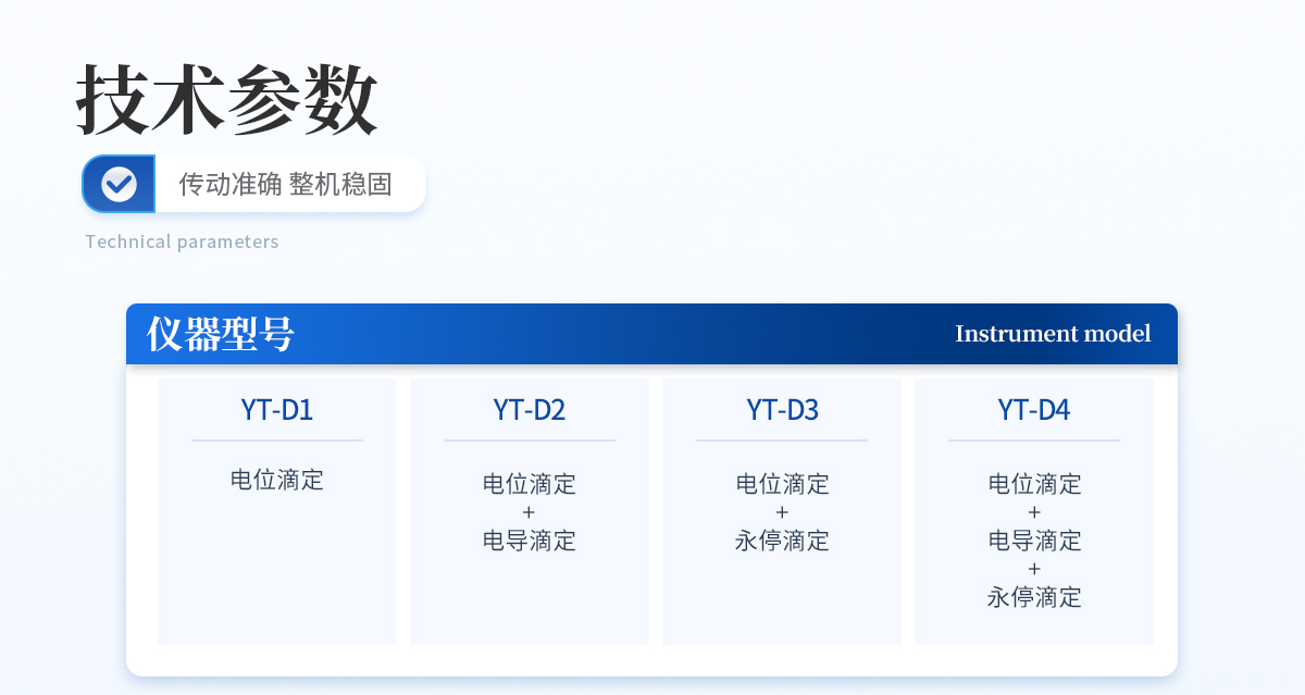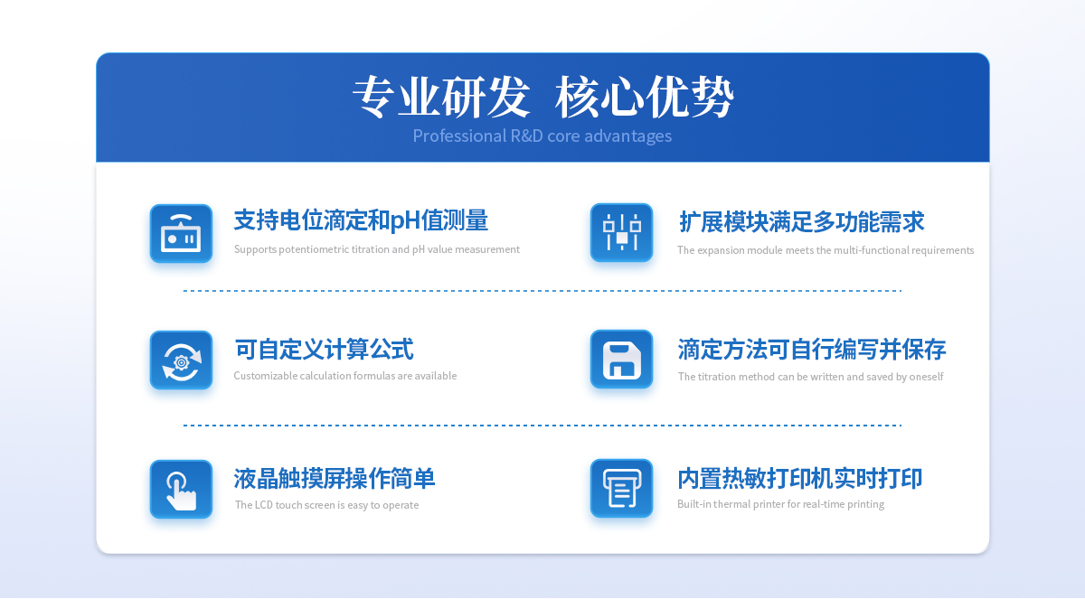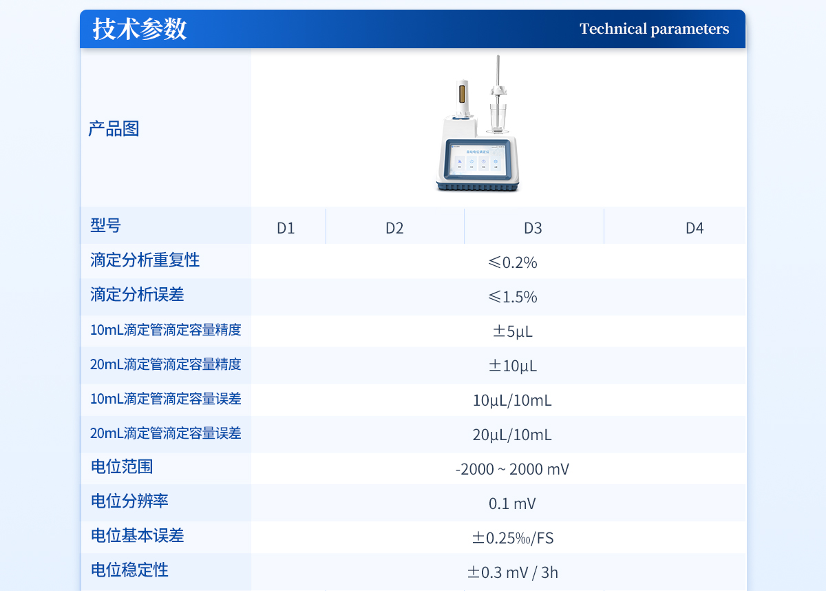 | 自動(dòng)電位滴定儀是一種用于化學(xué)分析的精密儀器,他通過自動(dòng)添加滴定劑來確定樣品中特定成分的濃度。該儀器基于電位滴定原理工作,即根據(jù)在滴定過程中電池電動(dòng)勢的變化來確定滴定終點(diǎn)的一款滴定設(shè)備。設(shè)備滿足國家檢定規(guī)程JJG 814-2015《自動(dòng)電位滴定儀》儀器級(jí)別中的0.05級(jí)別,即儀器**示值誤差為±1.5%,儀器示值重復(fù)性≤0.2% |