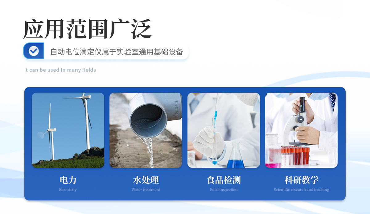 | 自動(dòng)電位滴定儀屬于實(shí)驗(yàn)室通用基礎(chǔ)設(shè)備,使用非常廣泛,可應(yīng)用在食品、藥檢、疾控、商檢、水處理、石油、化工、海洋、電力、環(huán)保、新能源、教學(xué)、科研等相關(guān)領(lǐng)域。 |