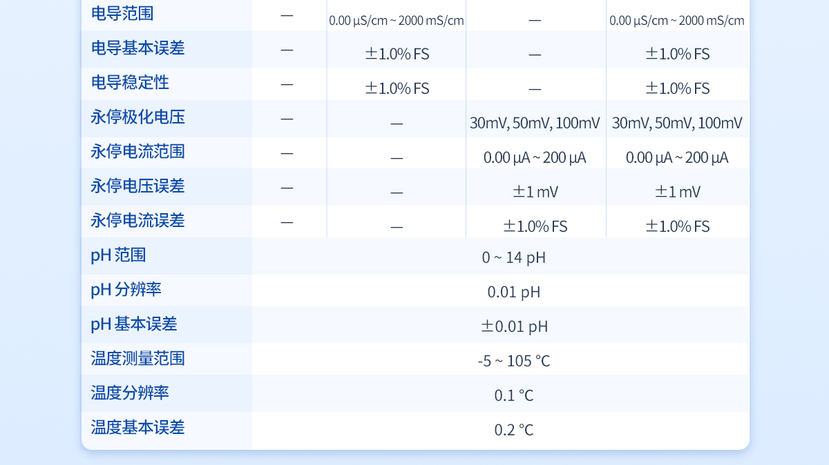| 滴定分析重復(fù)性:≤0.2% | 滴定分析誤差:≤1.5% | 10mL滴定管滴定容量精度:±5μL | 20mL滴定管滴定容量精度:±10μL | 10mL滴定管滴定容量誤差:10μL/10mL | 20mL滴定管滴定容量誤差:20μL/10mL | 電位范圍:-2000—2000mV | 電位分辨率:0.1mV | 電位基本誤差mV:±0.25‰/FS | 電位穩(wěn)定性mV:±0.3mV/3h | pH范圍:0-14PH | pH分辨率:0.01PH | 溫度測量范圍:-5 - 105℃ | 溫度分辨率:0.1℃ | 溫度基本誤差:0.2℃ |