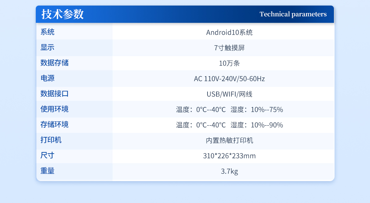 | 系統(tǒng):Android10系統(tǒng) | 顯示:7寸觸摸屏 | 數(shù)據(jù)存儲(chǔ):10萬條 | 電源:AC 110V-240V/50-60Hz | 數(shù)據(jù)接口:USB/WIFI/網(wǎng)線 | 使用環(huán)境:溫度:0℃--40℃ 濕度:10%--75% | 存儲(chǔ)環(huán)境:溫度:0℃--40℃ 濕度:10%--90% | 打印機(jī):內(nèi)置熱敏打印機(jī) | 尺寸:310*226*233mm | 重量:3.7kg |