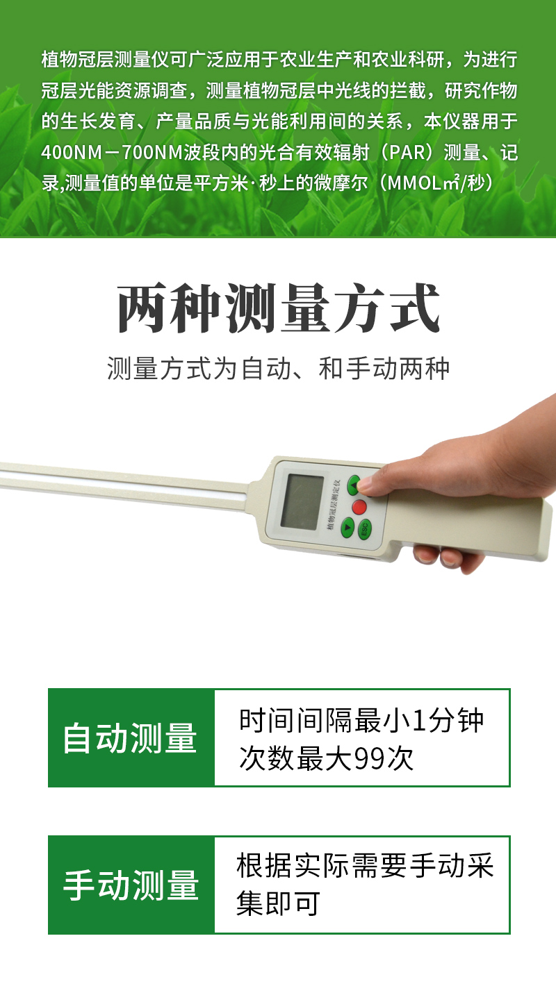 魚眼鏡頭可以伸入至冠層中:鏡頭安裝在搖臂一端,由于小巧和帶有測量桿,可以方便地水平向前或垂直向上伸入到冠層不同高度處,快速地進(jìn)行分層測量,測出群體內(nèi)光透過率和