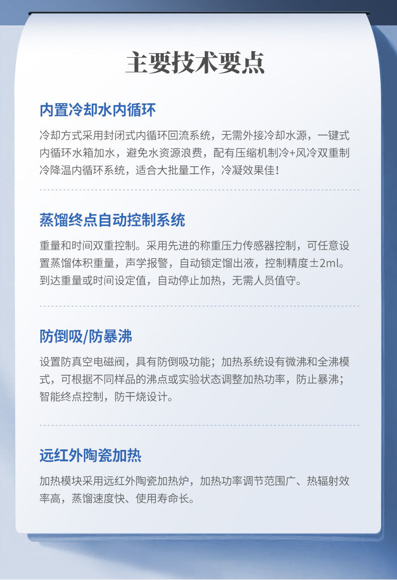 5、蒸餾終點(diǎn)控制:自動偵測蒸餾終點(diǎn)功能,采用稱重和時間雙重控制,蒸餾體積控制在±2ml之內(nèi),自動化程度高;