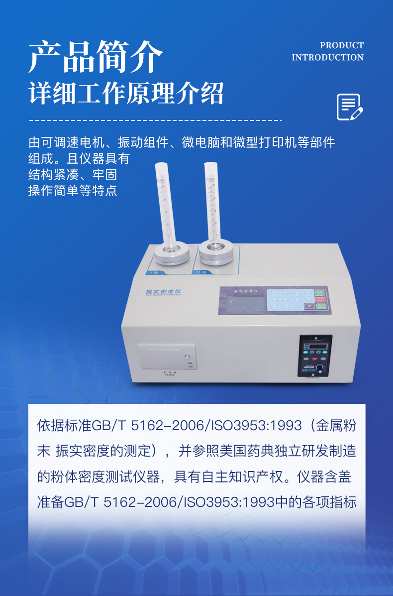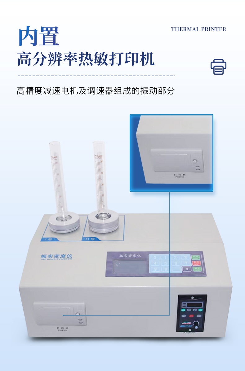 | YT-ZS2型粉體密度測試儀是由丹東市恒瑞儀器有限公司依據(jù)標(biāo)準(zhǔn)GB/T 5162-2006/ISO3953:1993(金屬粉末 振實密度的測定),并參照美國藥典獨立研發(fā)制造的粉體密度測試儀器,具有自主知識產(chǎn)權(quán)。儀器含蓋準(zhǔn)備GB/T 5162-2006/ISO3953:1993中的各項指標(biāo)。 | YT-ZS2型粉體密度測試儀由可調(diào)速電機(jī)、振動組件、微電腦和微型打印機(jī)等部件組成。且儀器具有結(jié)構(gòu)緊湊、牢固,操作簡單等特點。 |